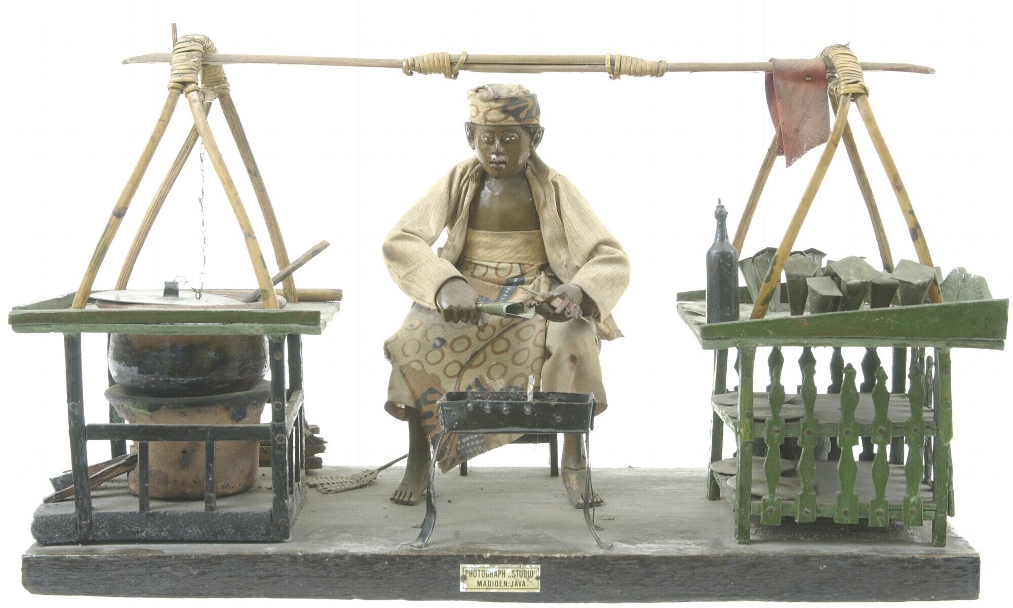 Model van een soto- en sateverkoper met stalletje en...