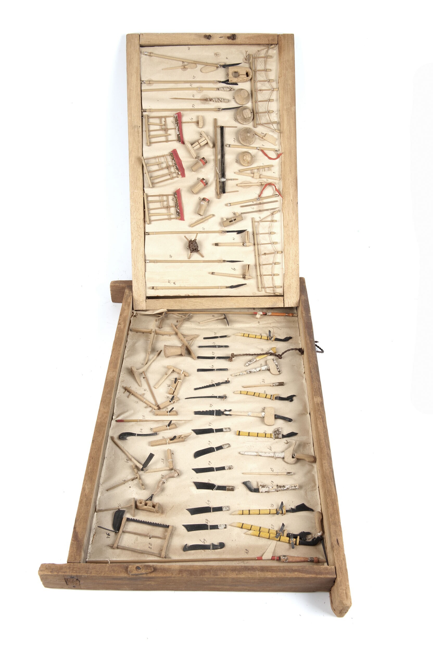 Houten doos met modellen van huisraad wapens muzieki...