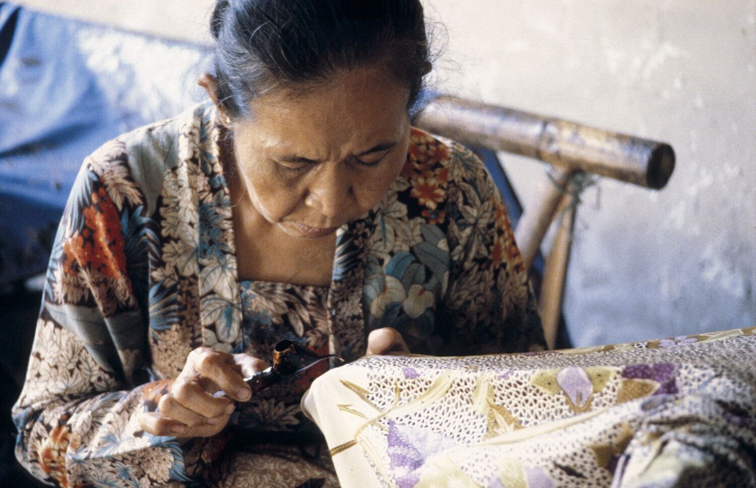 Vrouw aan het werk in het batik-atelier Masina