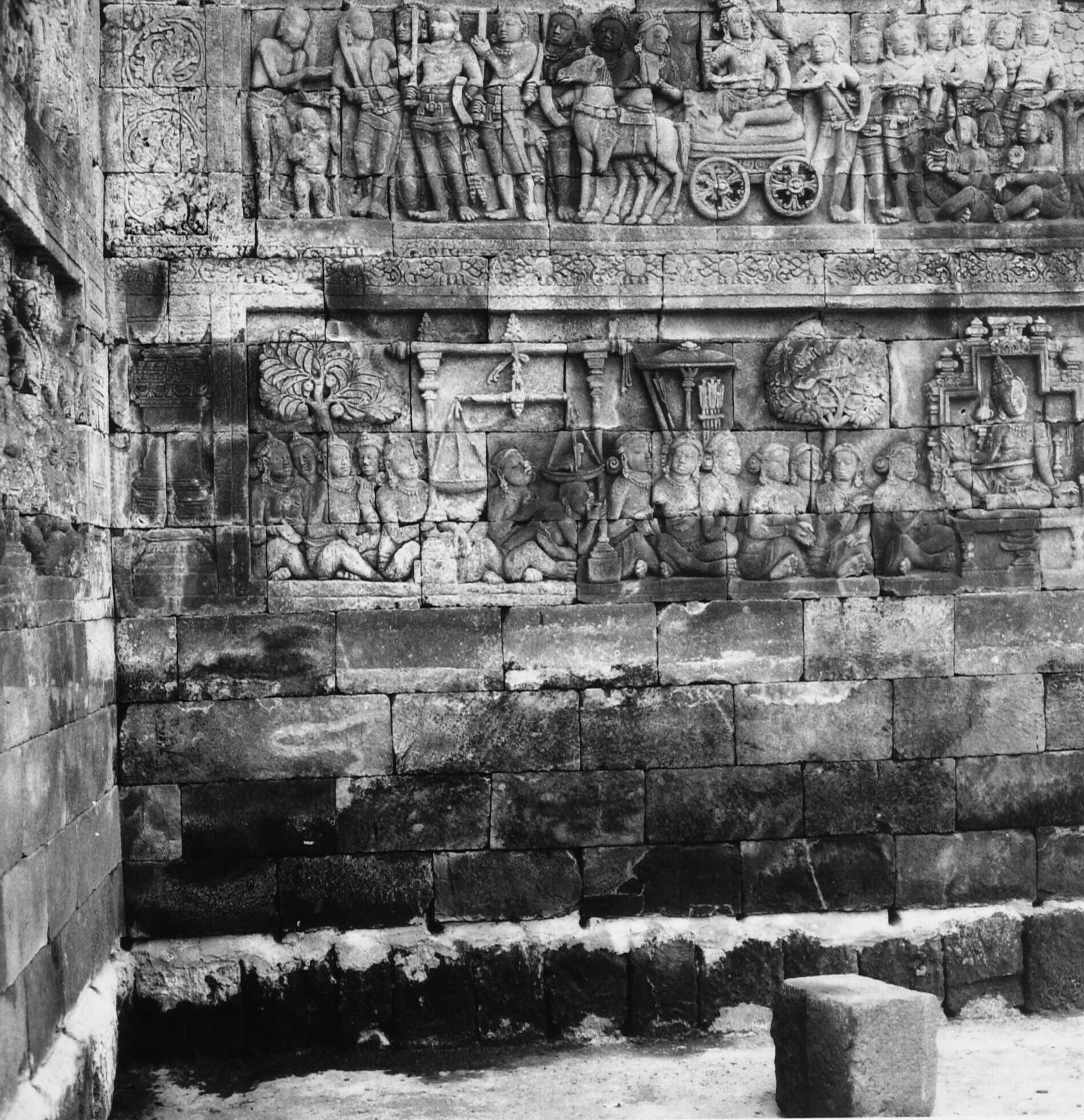 Detail van de Borobudur met reliëfs en een gerestaur...