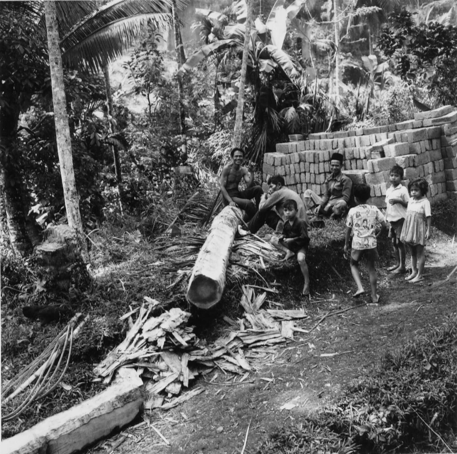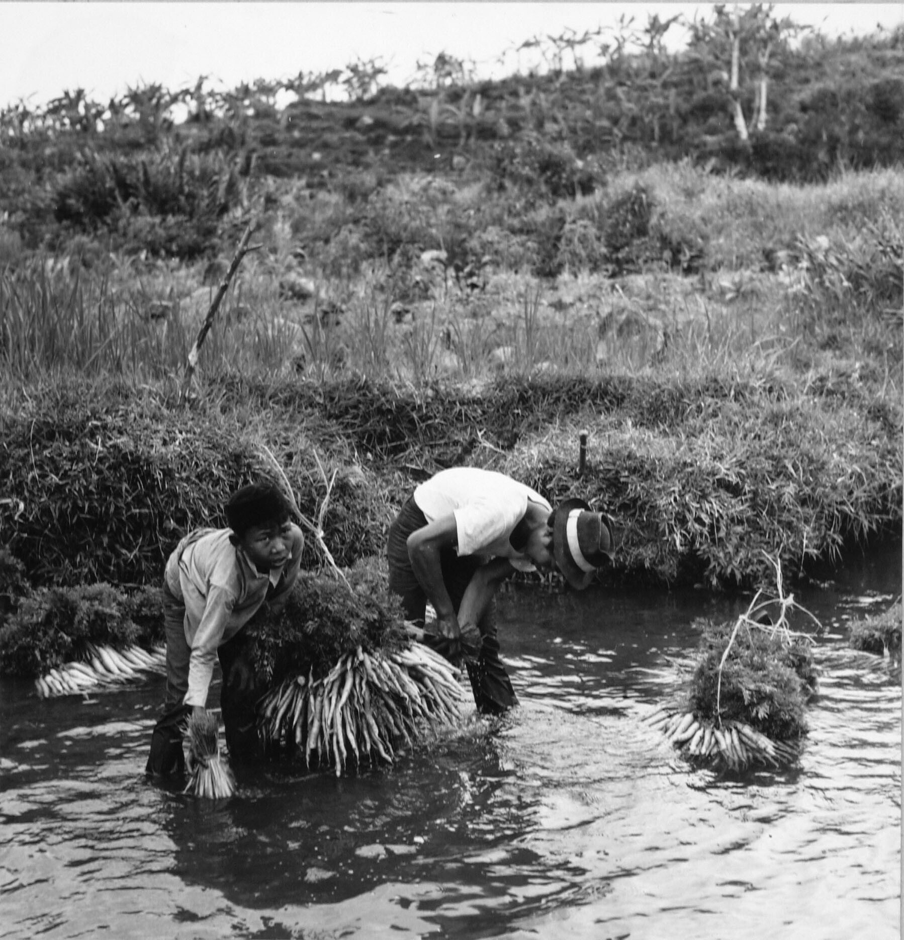 Mannen bewerken de grond van een rijstveld alvorens ...