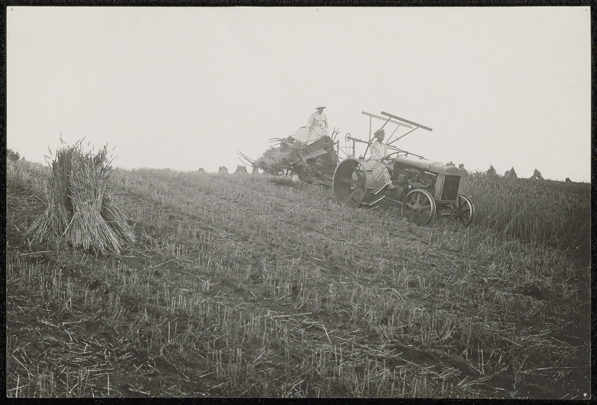Een maai- en bindmachine aan het werk op een tarweve...