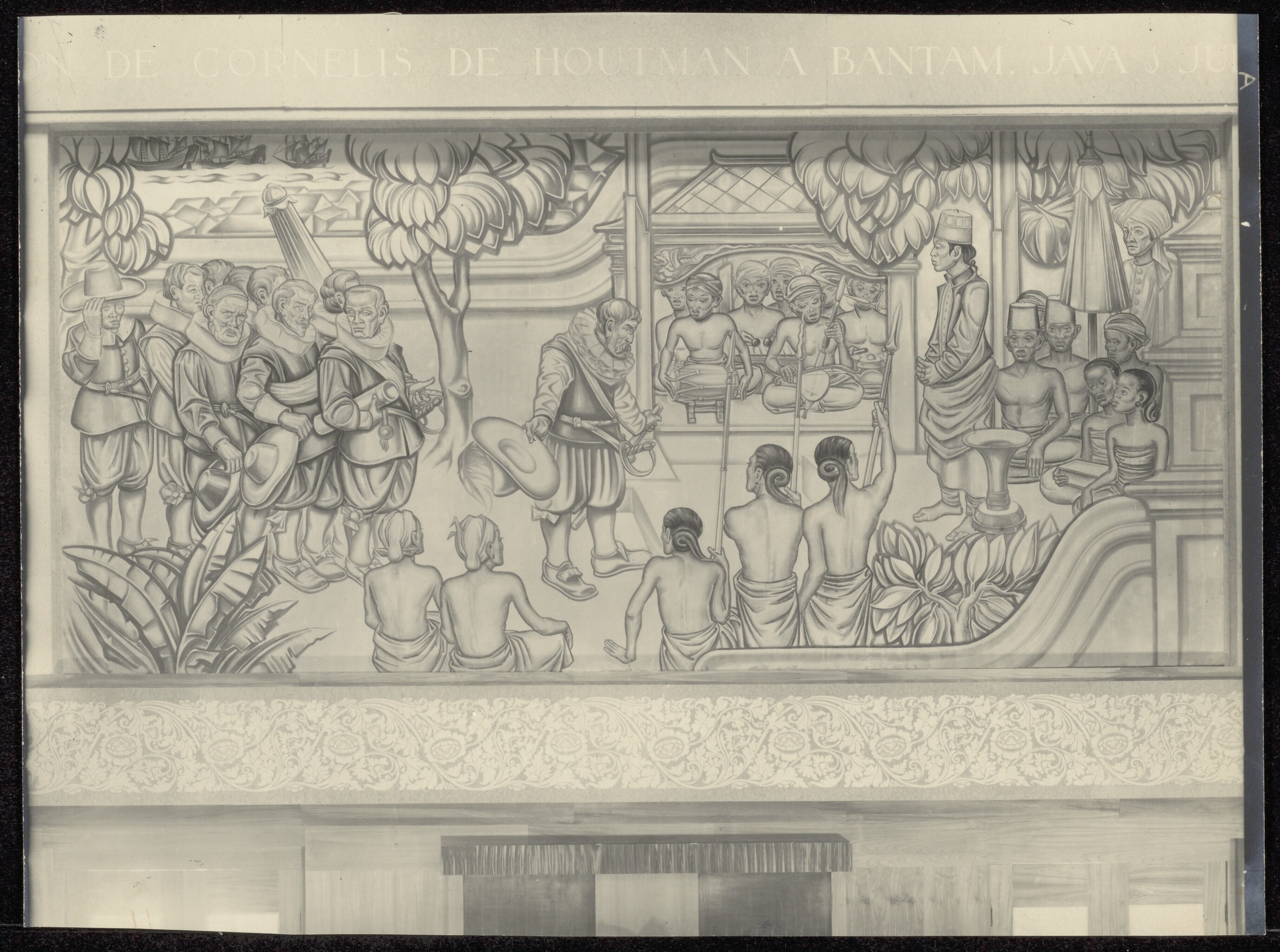 Wandschildering 'La réception de Cornelis de Houtman...