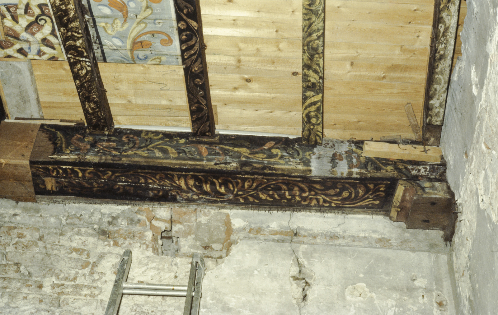Interieur, beschilderd plafond op beschilderde balklaag