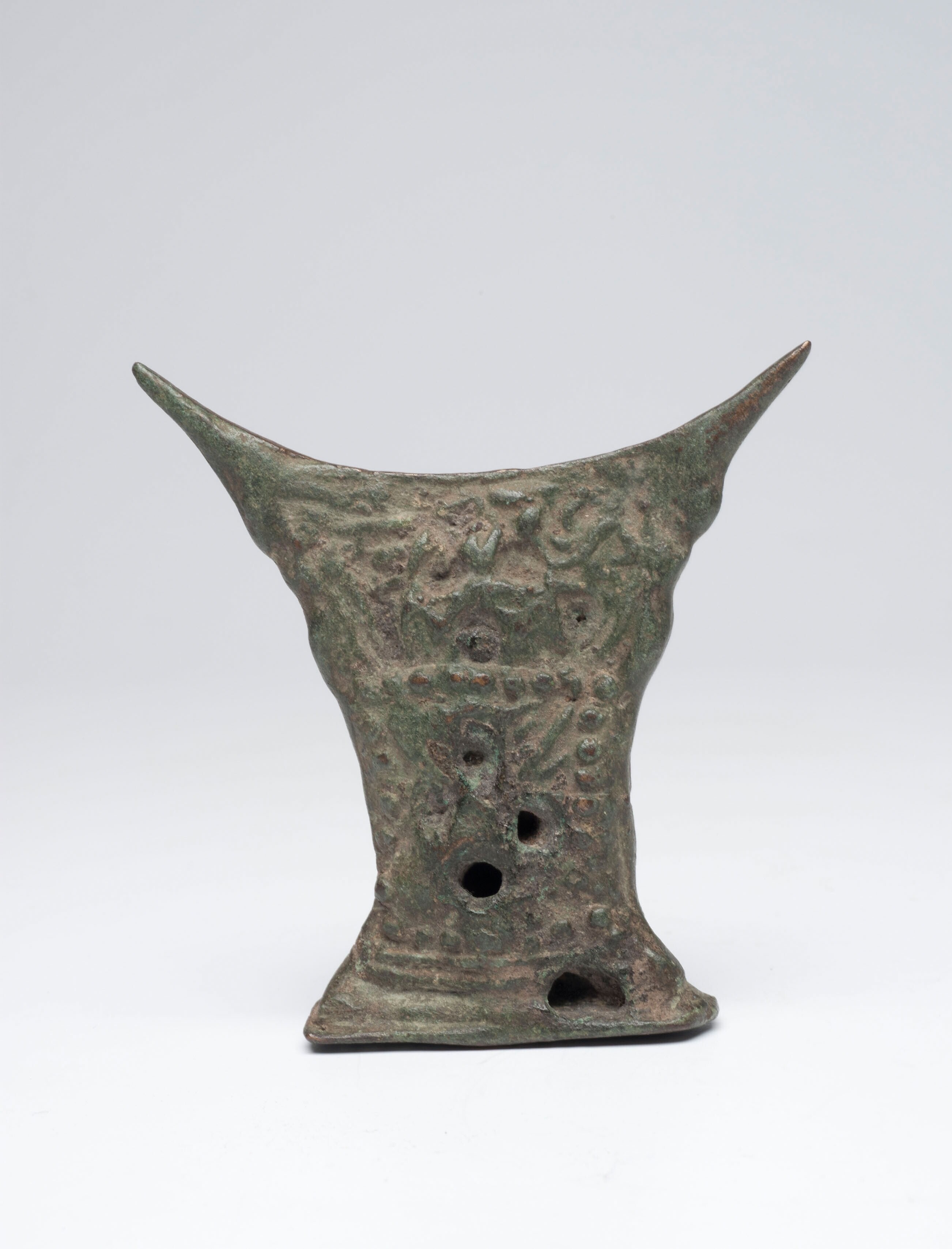 Bronzen spiegelhandvat met een versiering in de vorm...