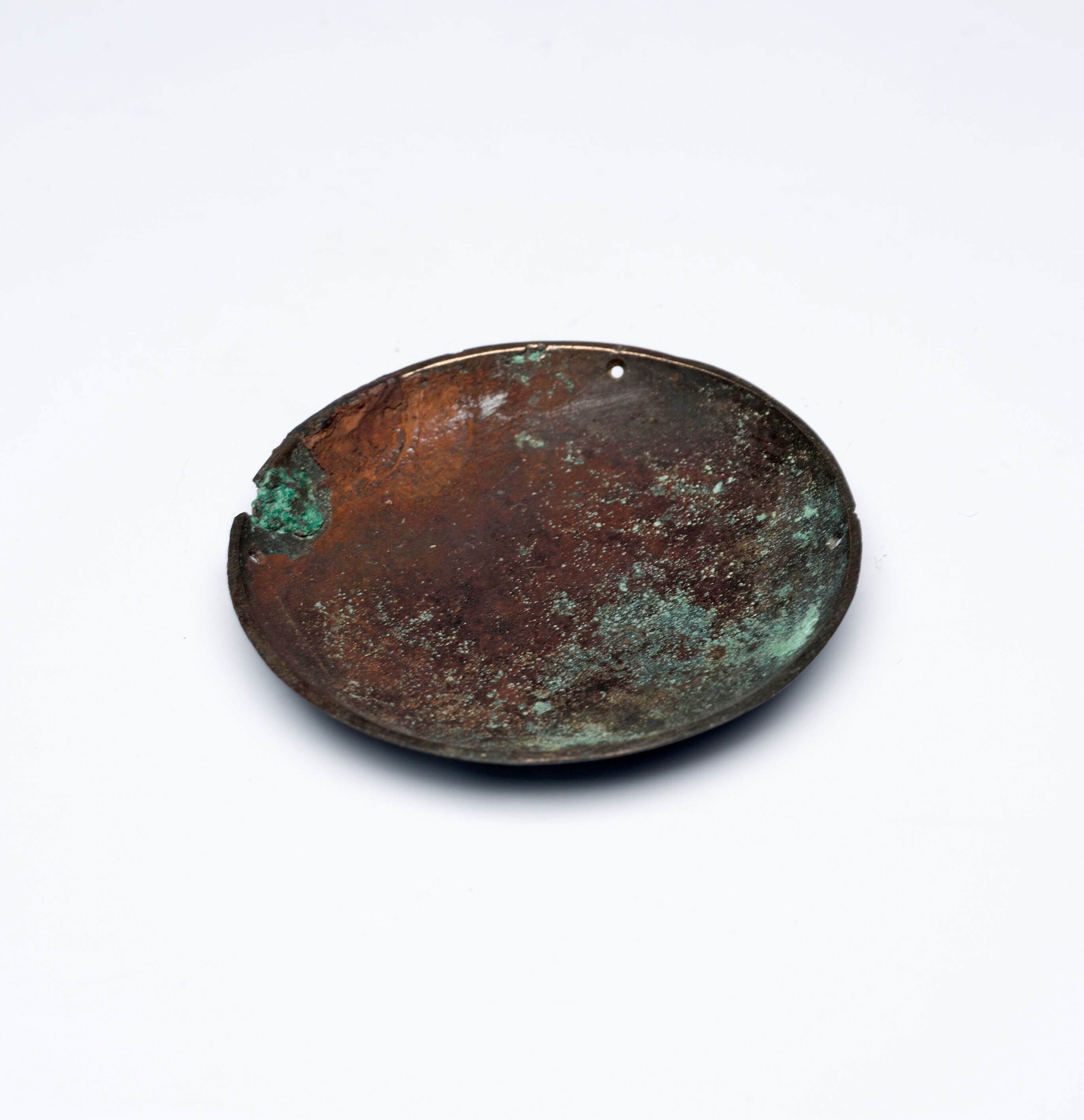 Ovaal bronzen plaatje met een ronde deuk in het midden