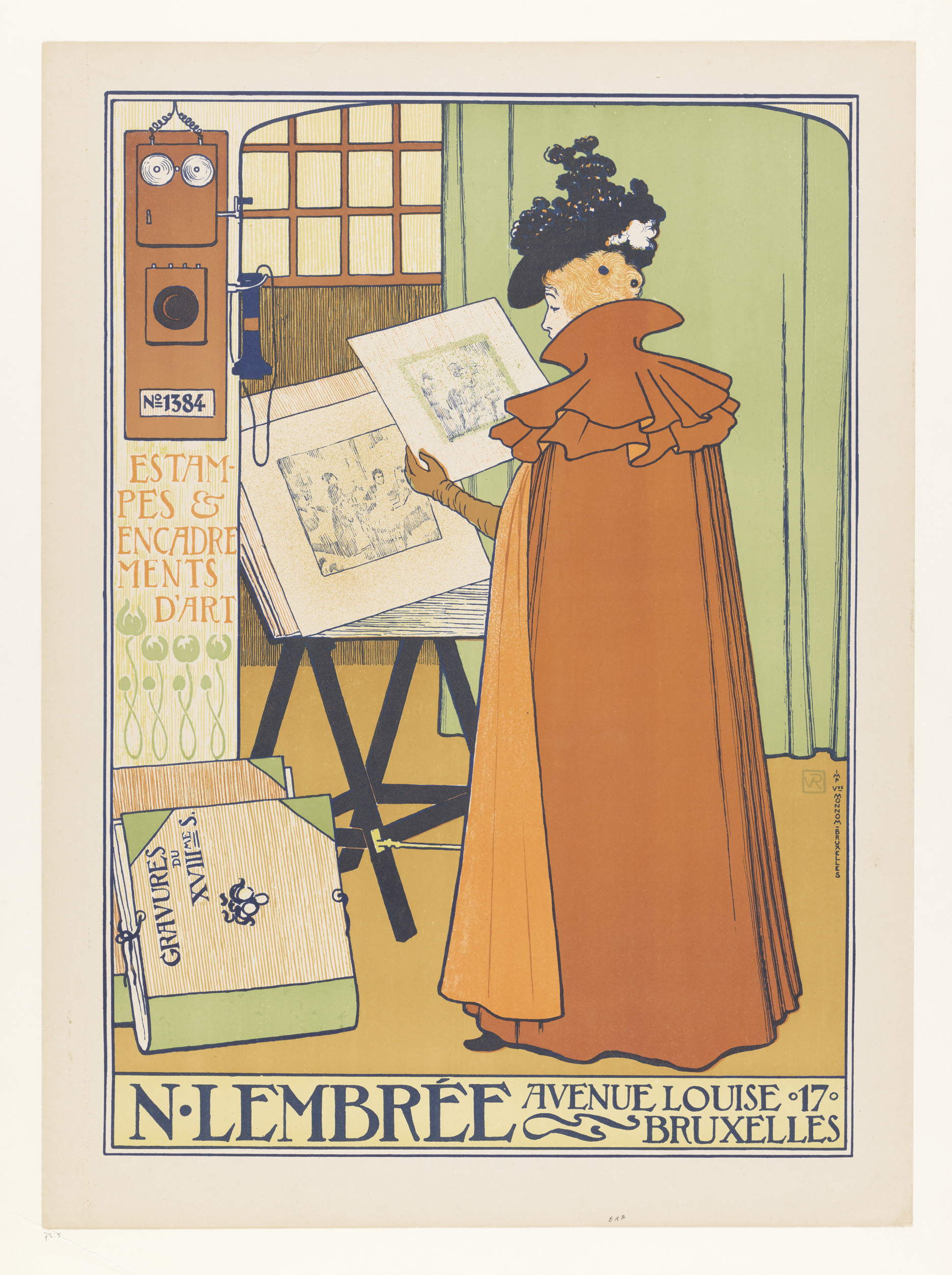 Vrouw met lange mantel bekijkt enkele prenten
