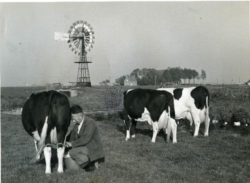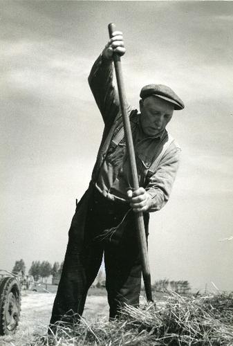 Foto in zwart-wit van een man die hoogveen afsteekt ...