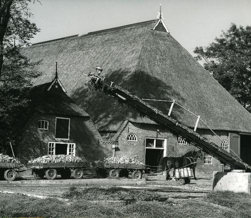 Foto in zwart-wit van een dorsmachine door J.D. de J...