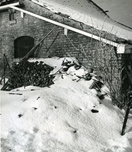 Foto in zwart-wit van een boerderij met stookhut doo...