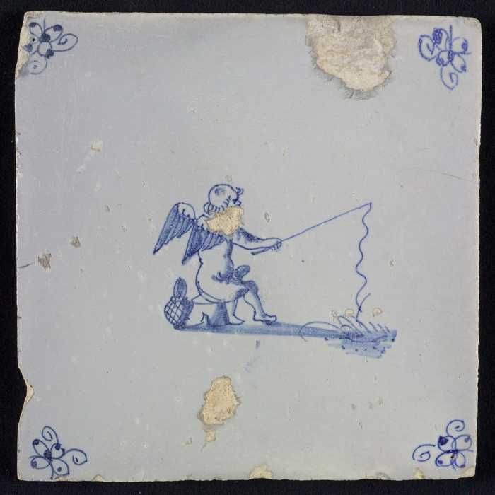 Figuurtegel, vissende engel of putto, blauw decor op...
