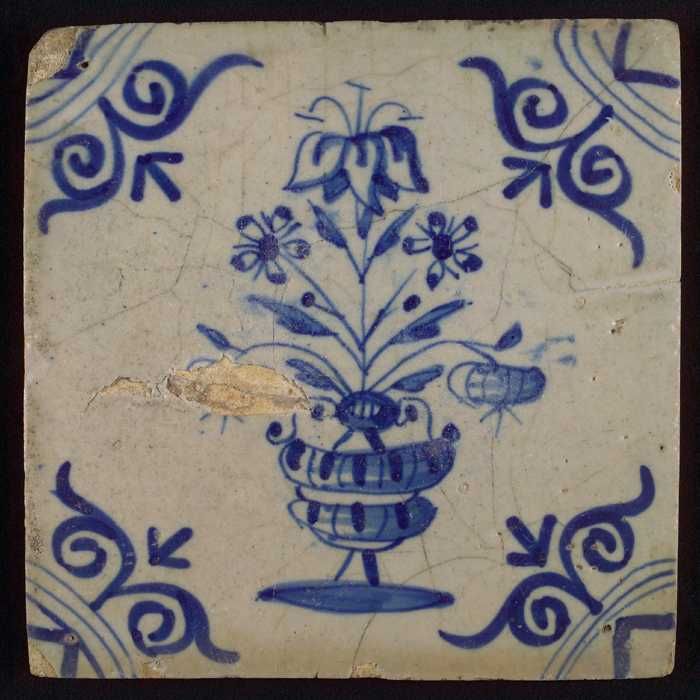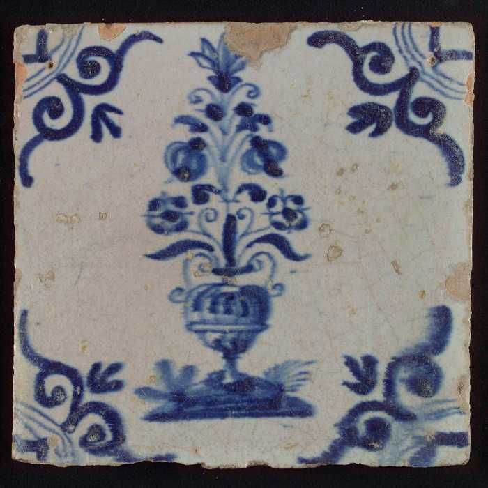Bloemtegel met grote bloempot, blauw decor op wit fo...