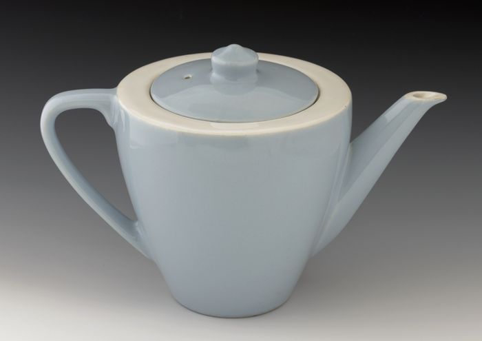 Lichtblauwe theepot (A) met witte rand en lichtblauw...