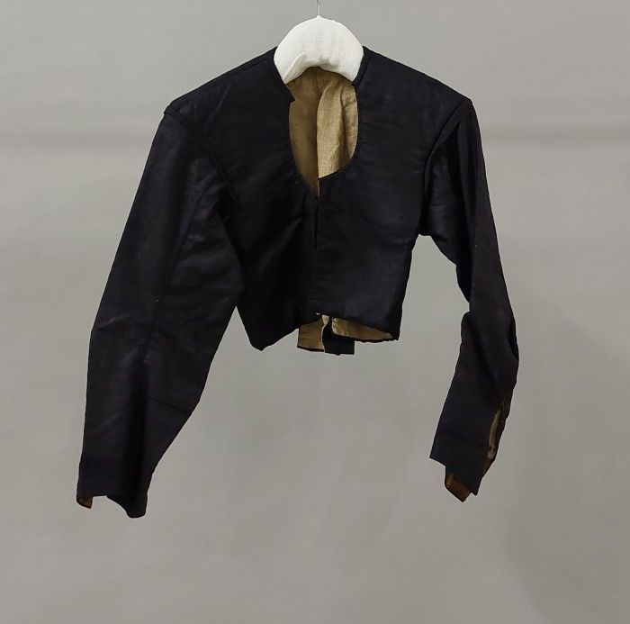 Donkerblauw jakje, met onderaan de mouwen groene zij...