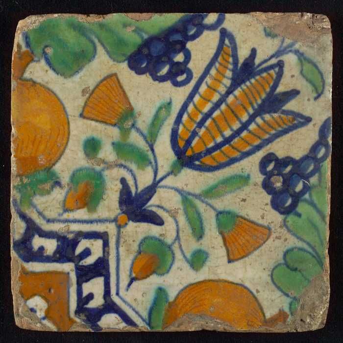 Ornamenttegel, stertulp met druiventrossen en oranje...