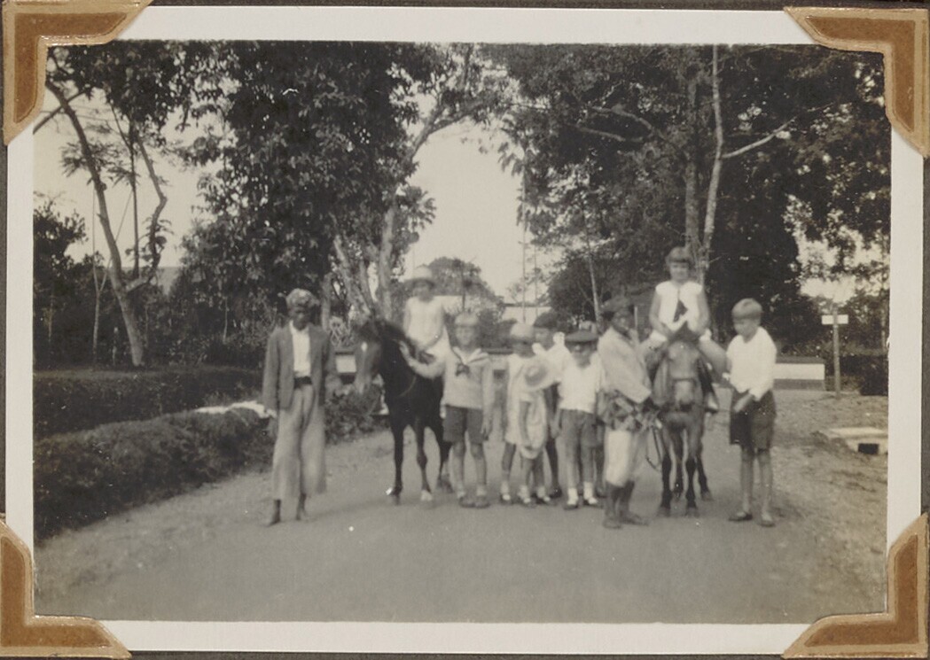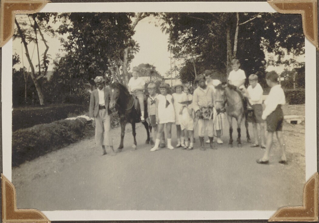 Groepsportret van jongens en meisjes met twee paarden