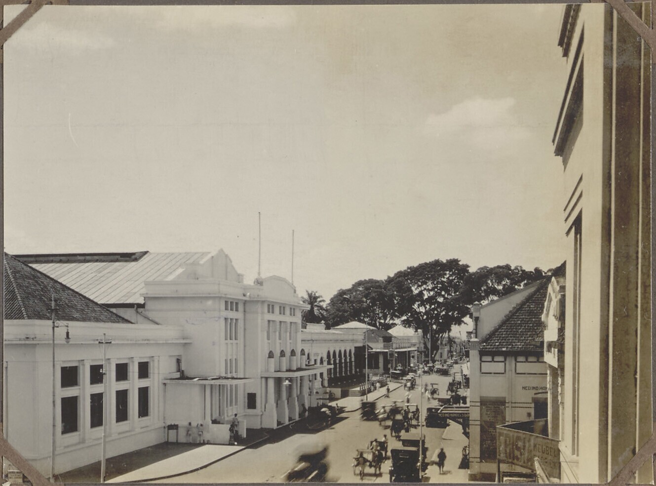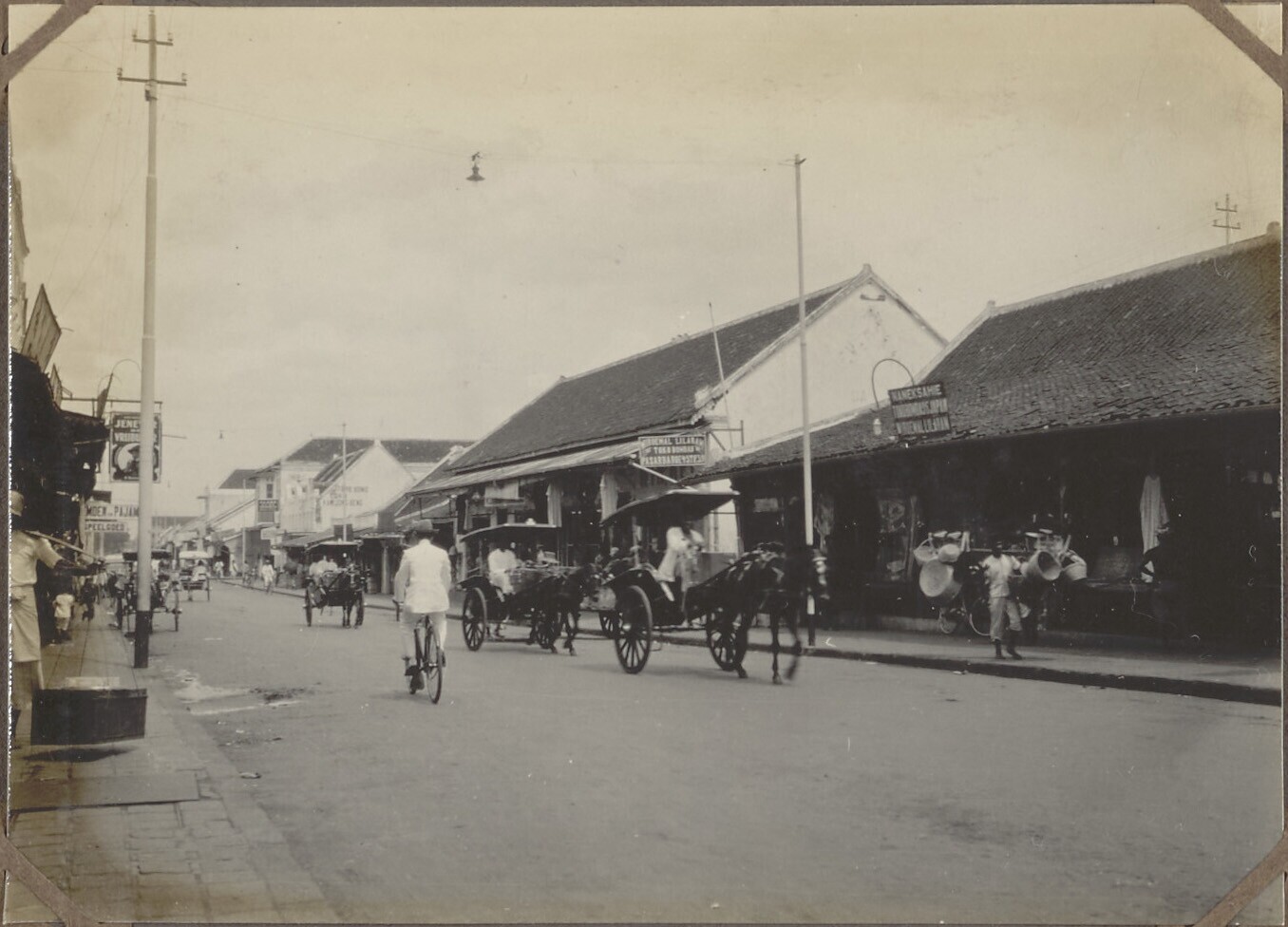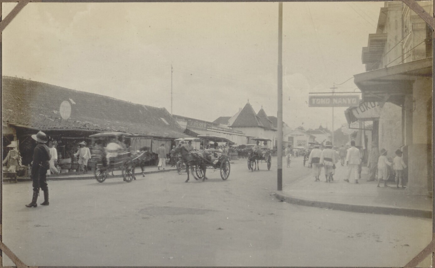 Zicht op straat met huizen en rijtuigen in Bandung, ...