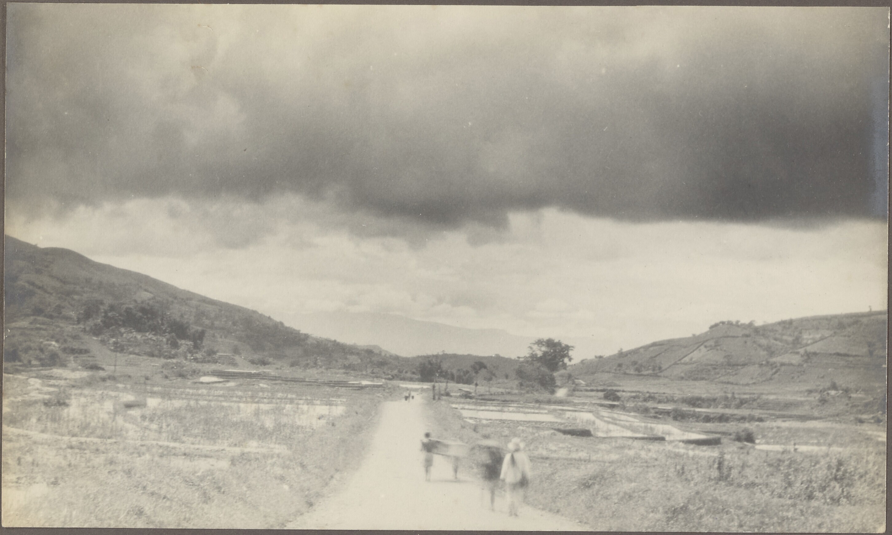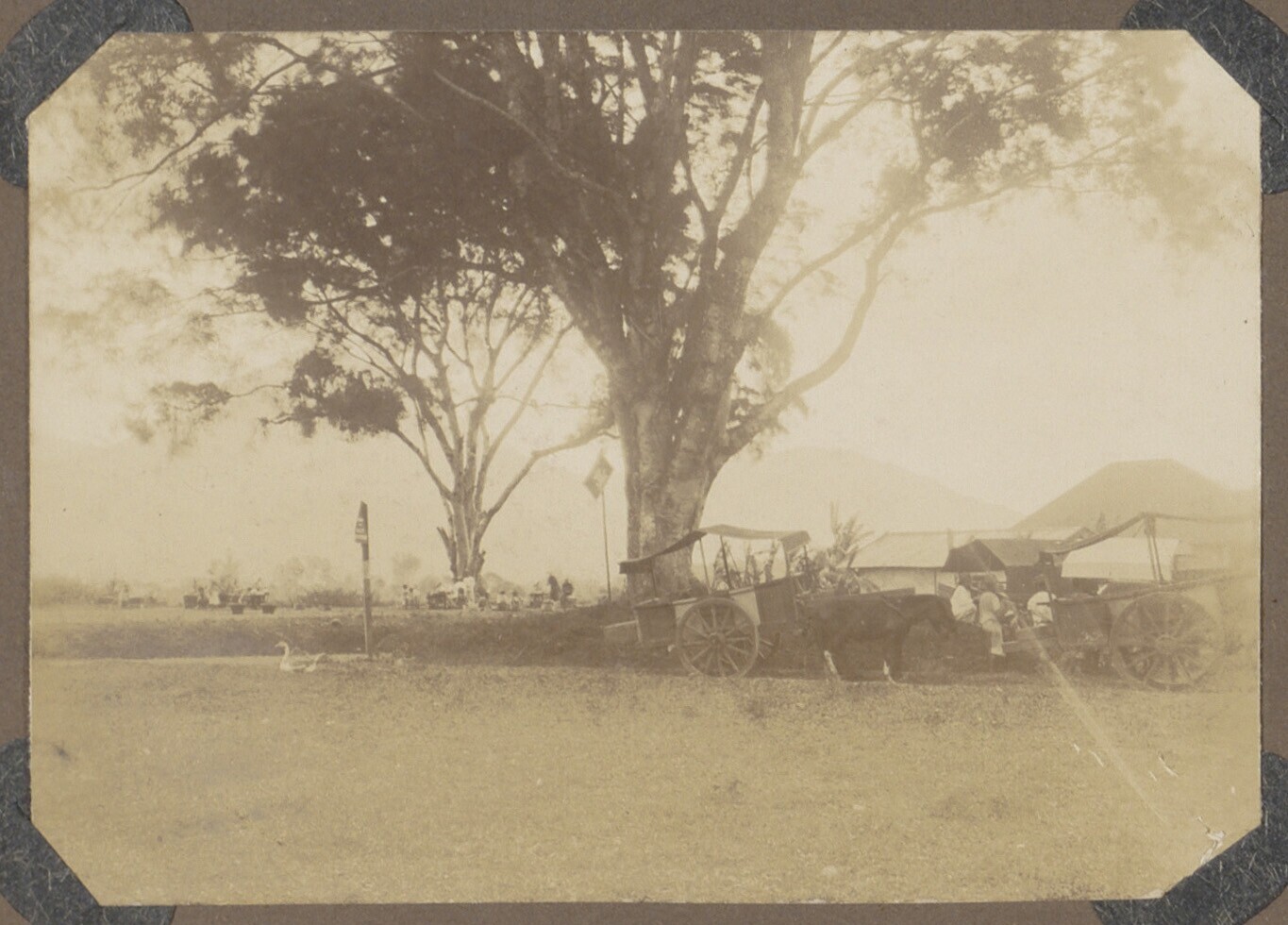 Landschapsportret met rechts Javanen met huifkarren