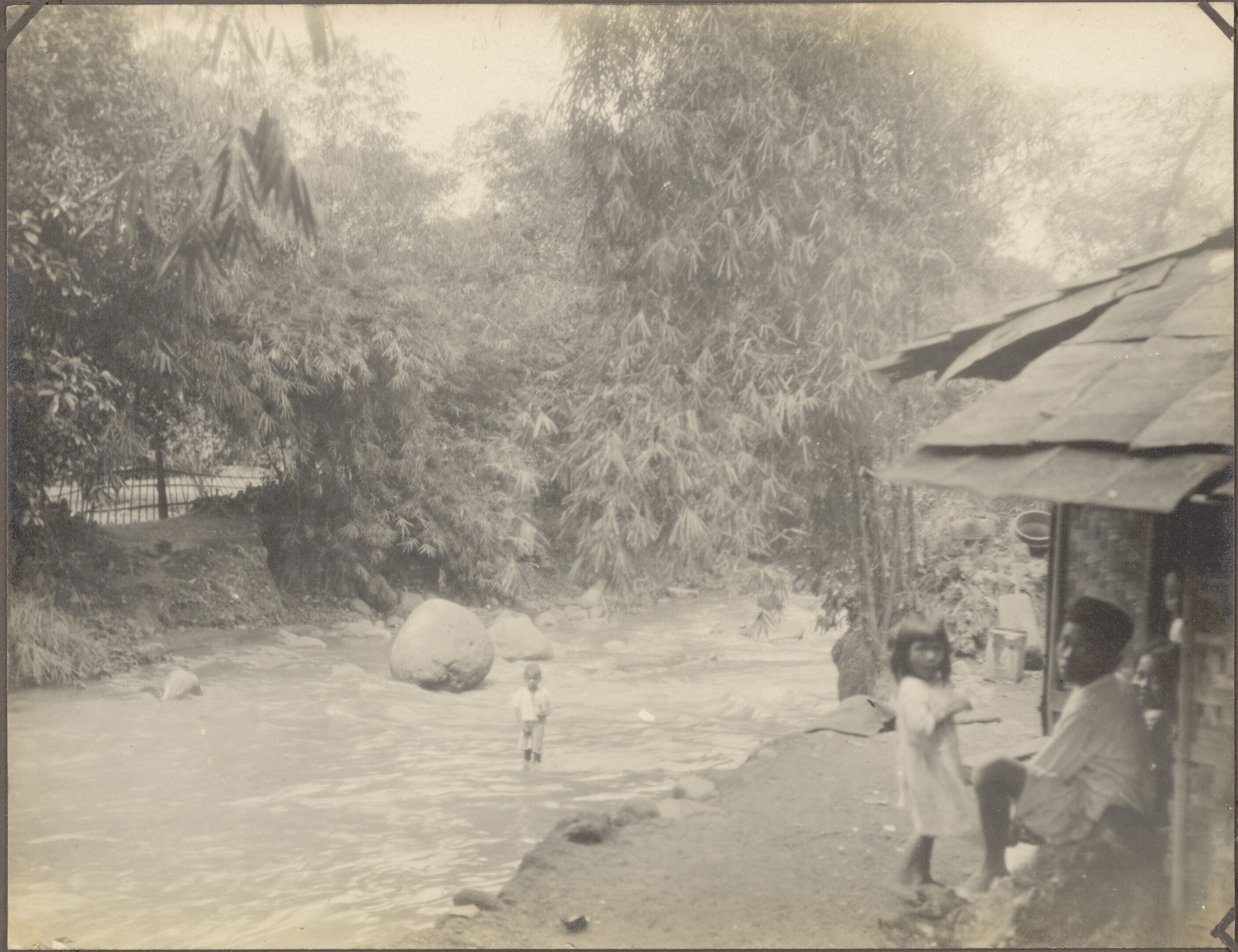 Kinderen bij een hut aan een rivier in een dorp in d...