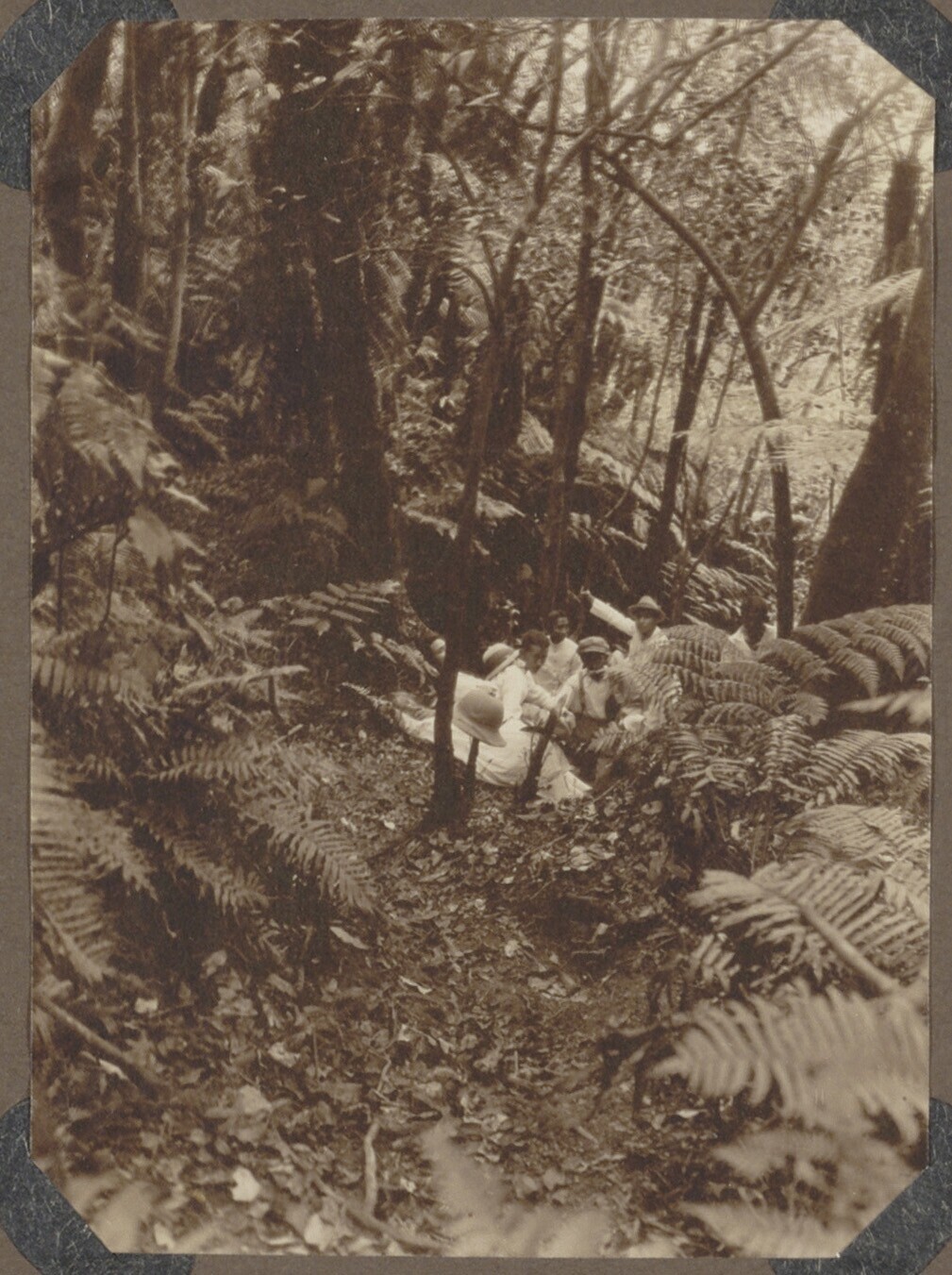 Expeditieleden rusten tussen de bomen en varens uit
