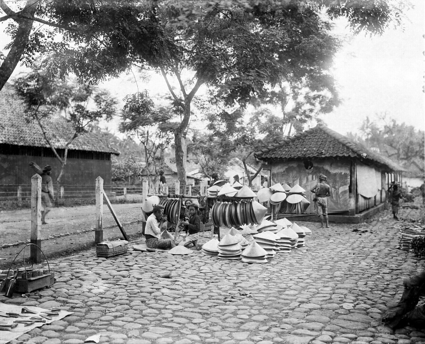Een verkoper met zonnehoeden op de markt in Salatiga