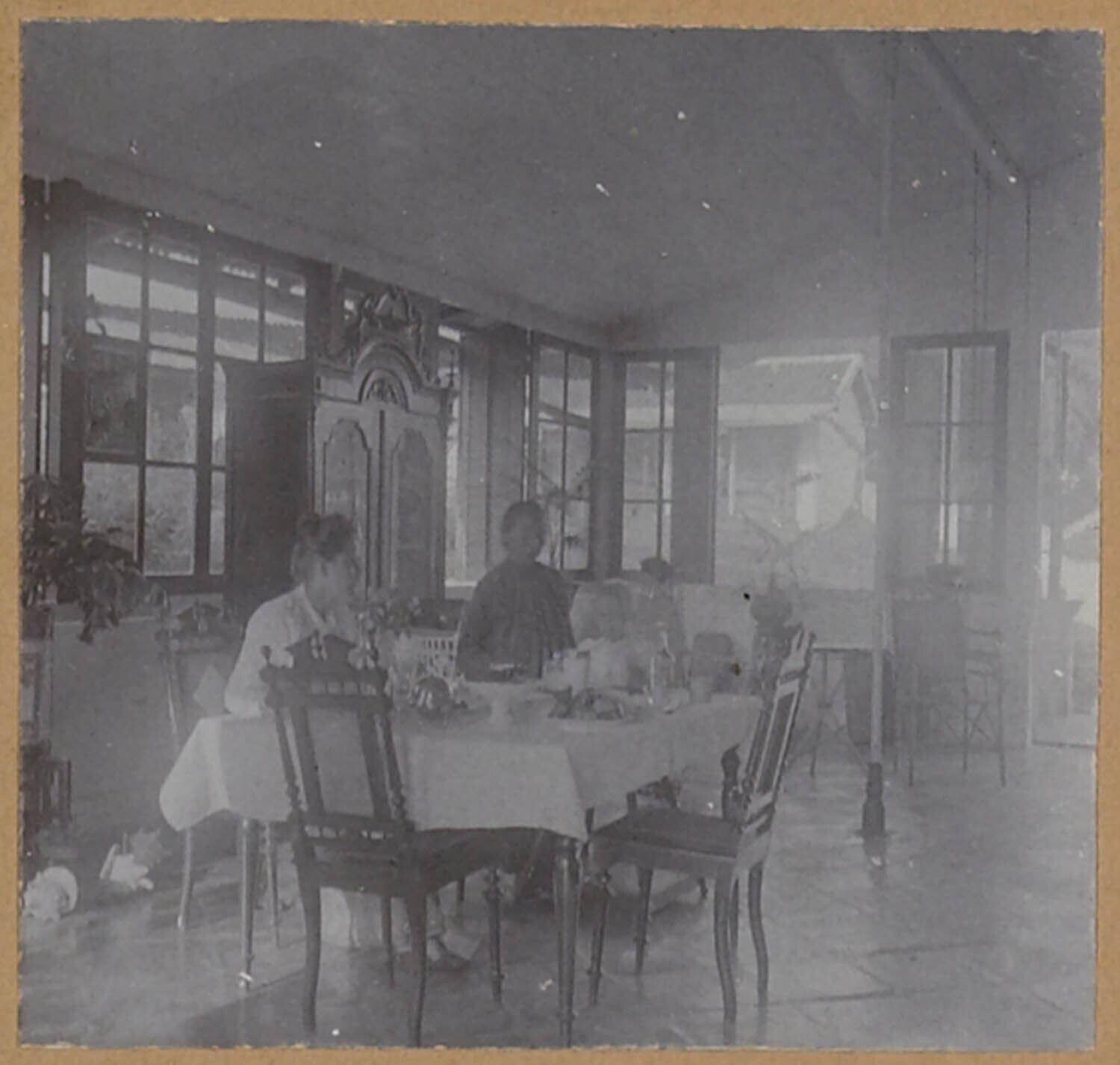 Twee vrouwen en kind zittend aan gedekte tafel op de...