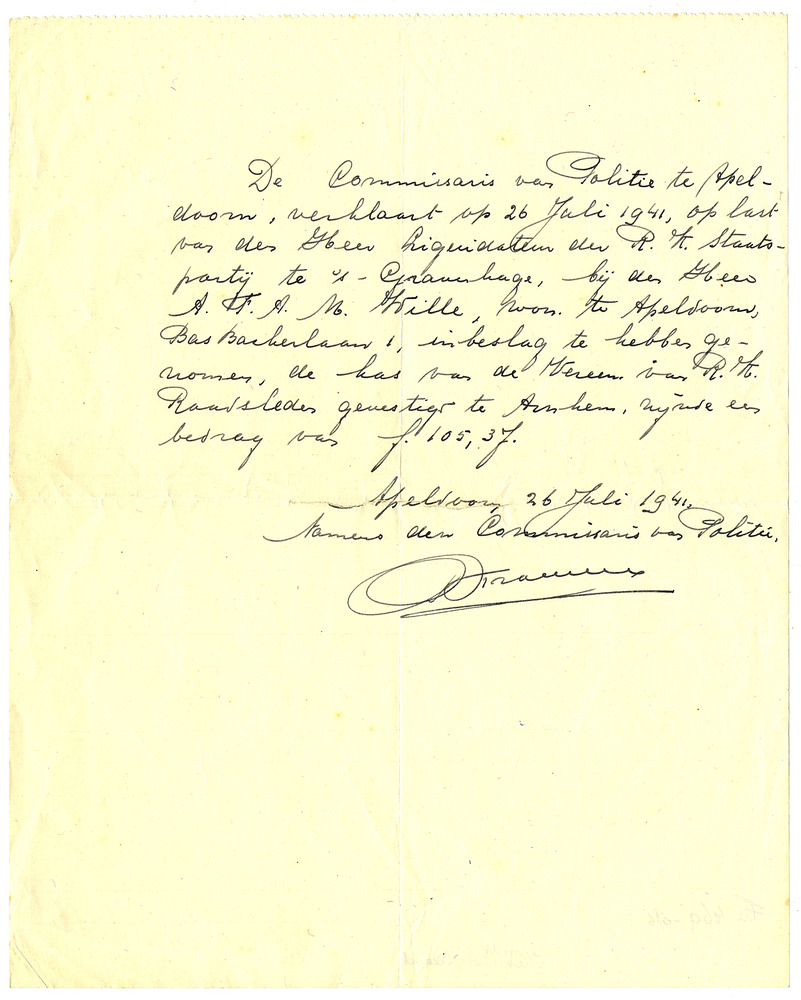 Brief over de inbeslagname van de kas van de Vereeni...