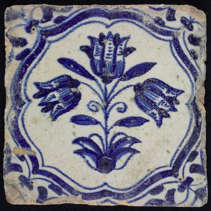 Bloemtegel, drietulp in accoladeomlijsting, blauw de...