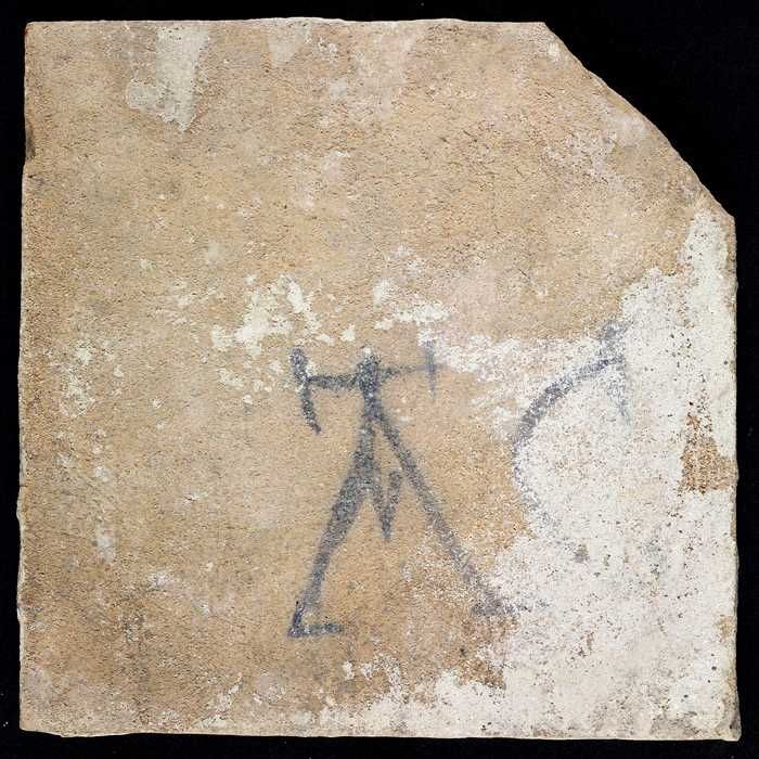 Figuurtegel, blauw, man met korte mantel, hoekmotief...