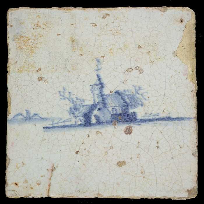 Tafereeltegel, blauw, huizen en kerk, hoekmotief spin