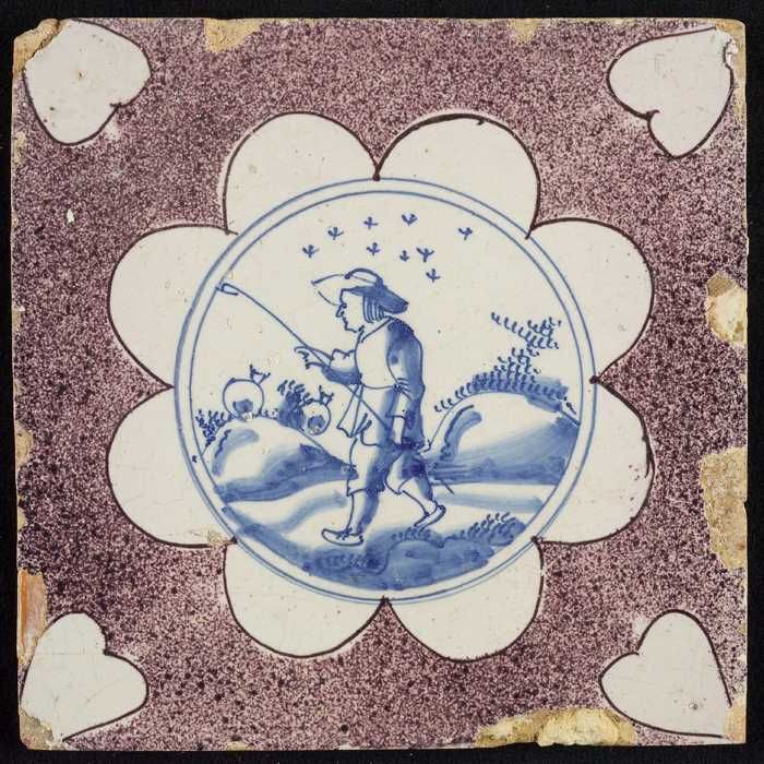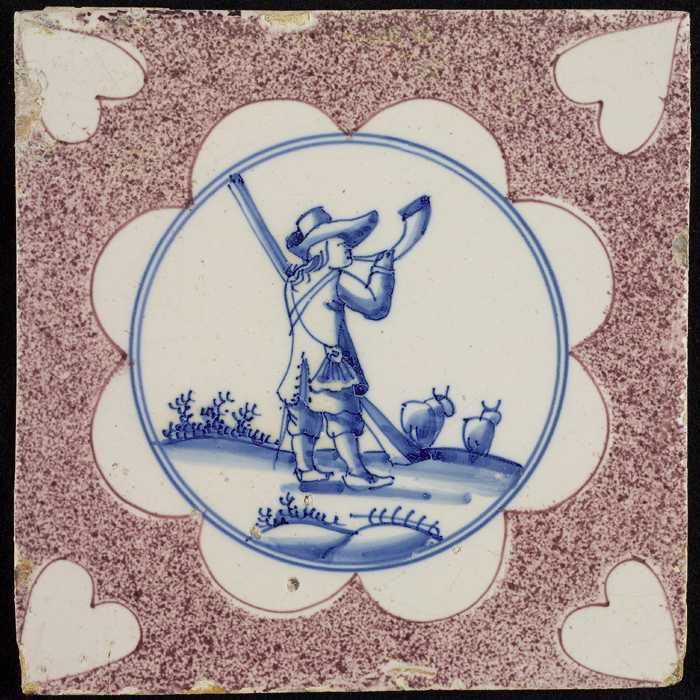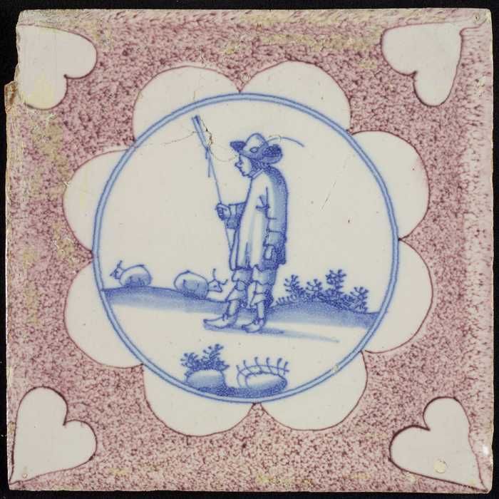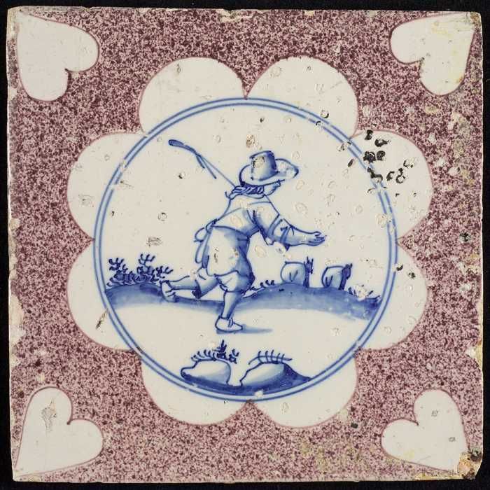 Figuurtegel, paars gesprenkelde tegel, herder met st...