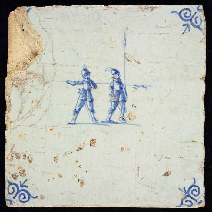 Figuurtegel, blauw, twee soldaten met lansen, hoekmo...