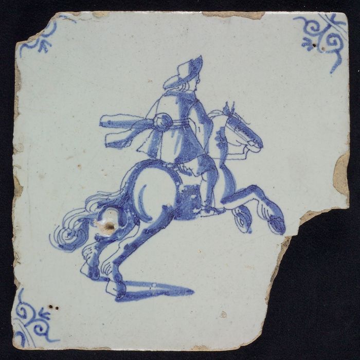Figuurtegel, blauw, ruiter op steigerend paard, hoek...