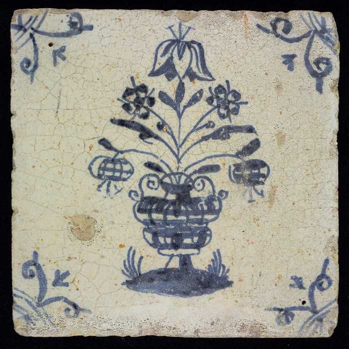 Bloemtegel, bloempot, blauw decor op wit fond, hoekm...