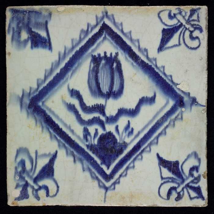 Bloemtegel met drietulp, blauw decor op wit fond, ac...