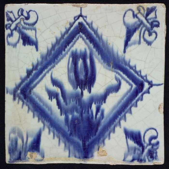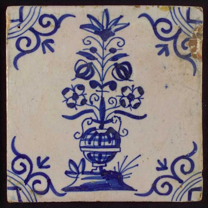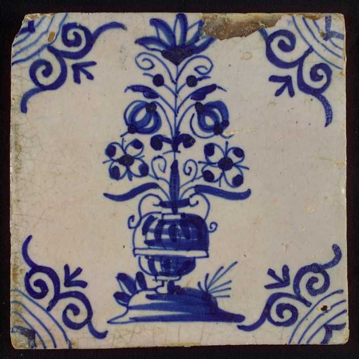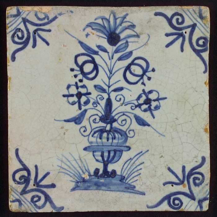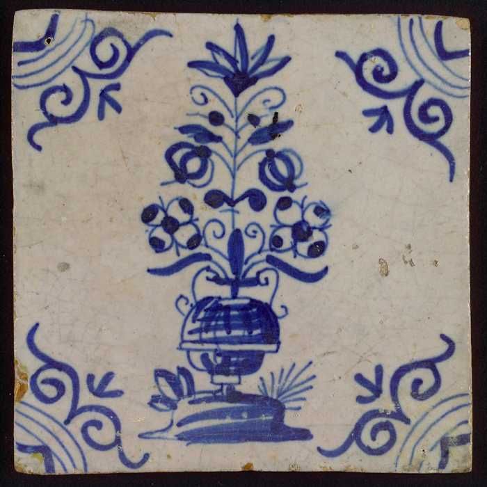 Bloemtegel, bloempot in blauw op wit, hoekmotief oss...