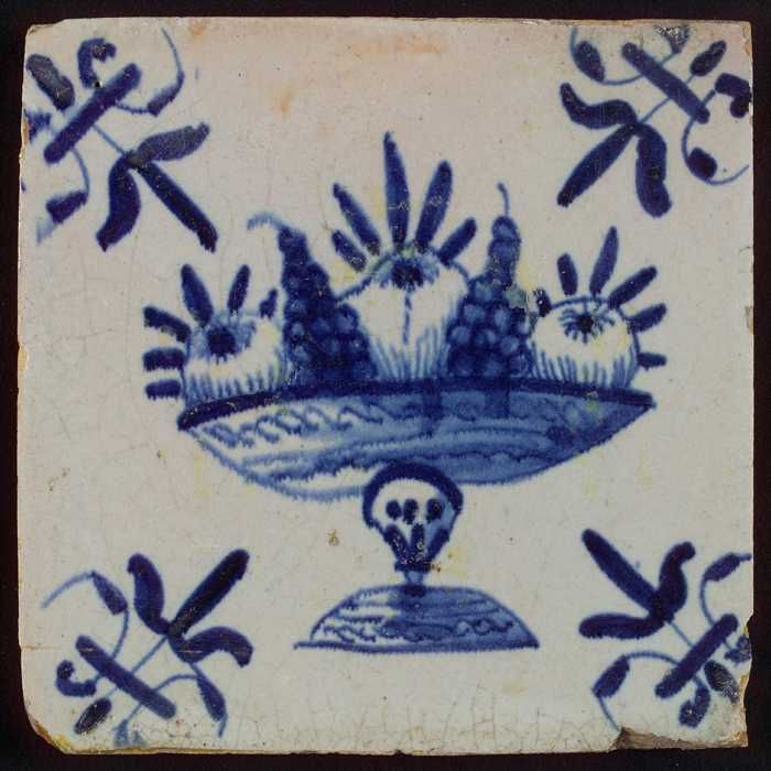 Tegel met blauwe fruitschaal; hoekmotief lelie