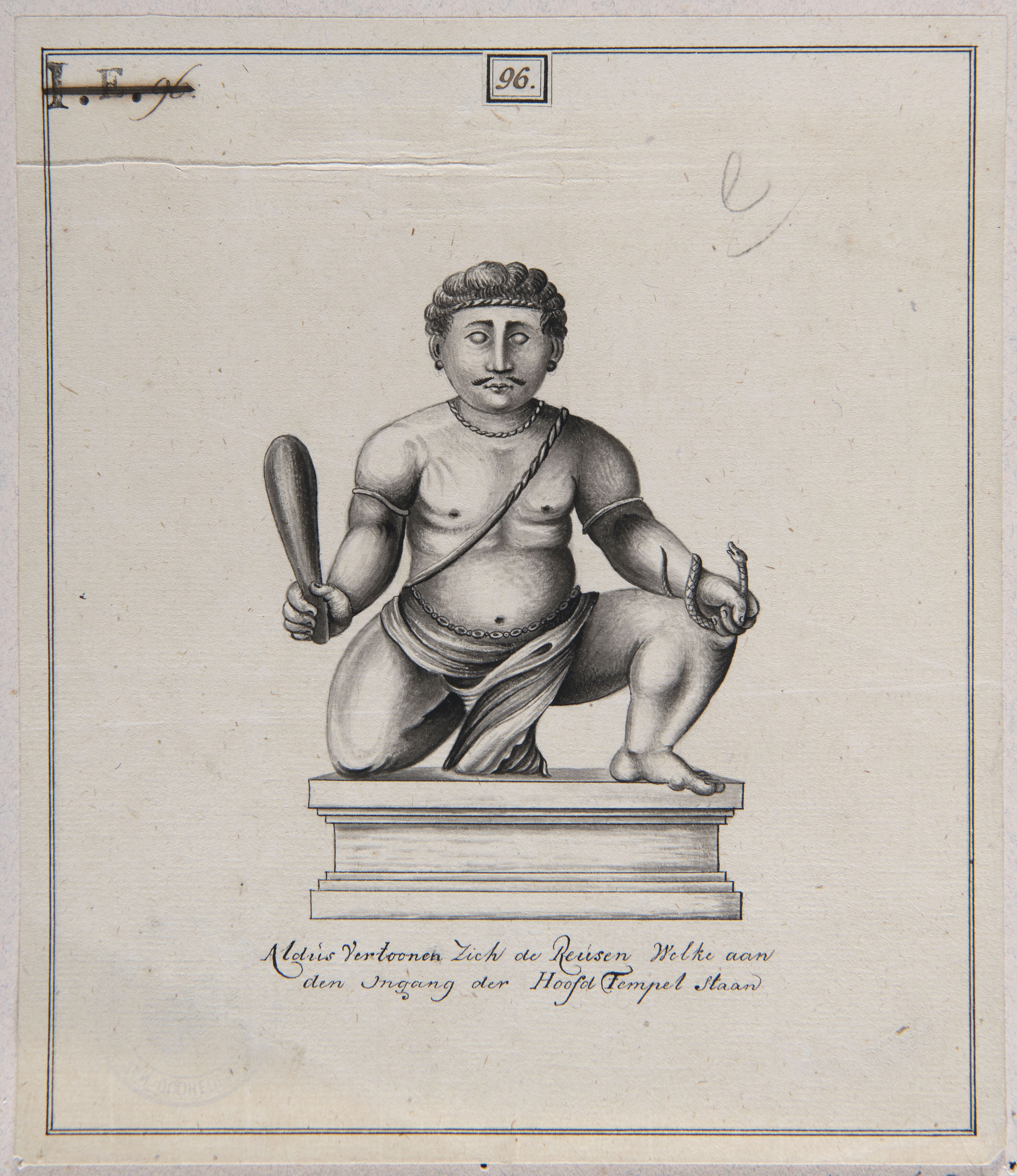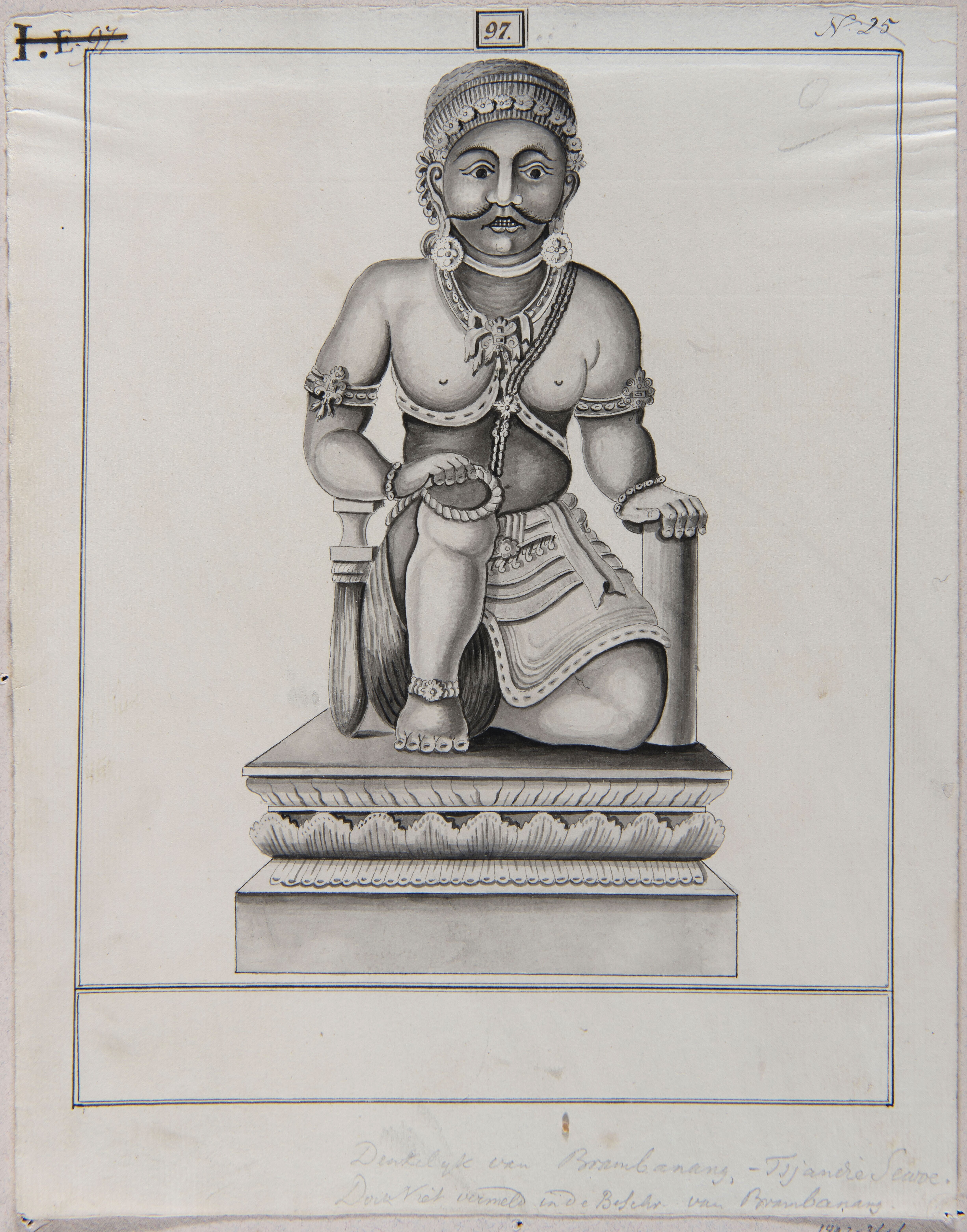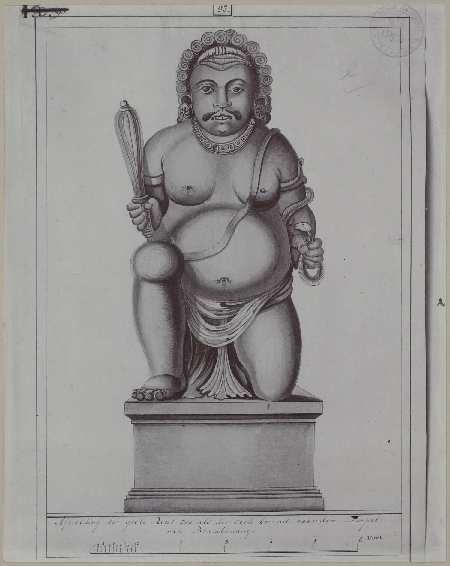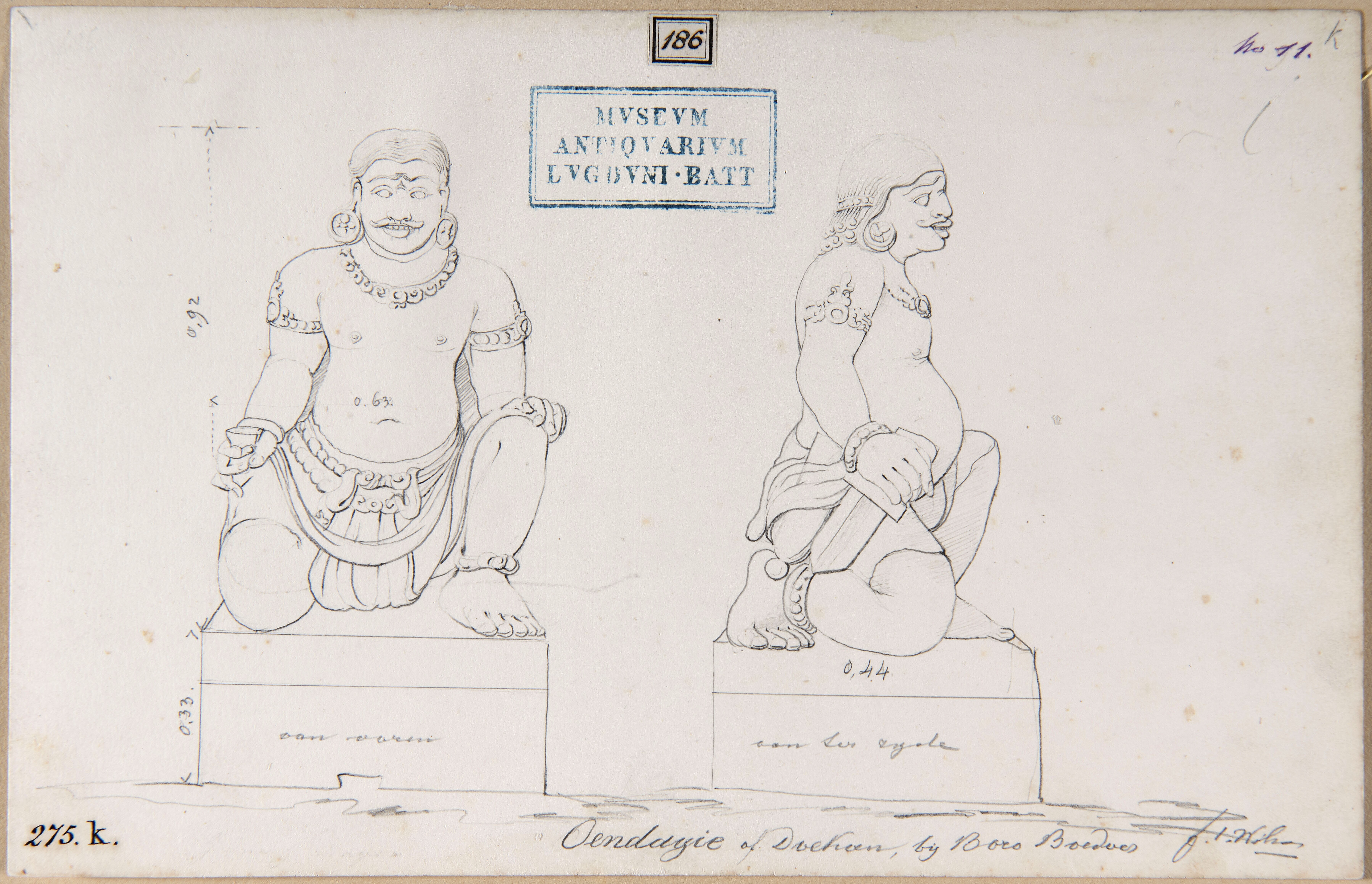 Een foto van twee stenen beelden (Nandi's) in Tjoepo...