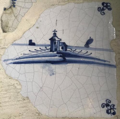 Tegel van aardewerk met tinglazuur voorstellende Lan...