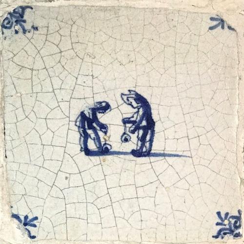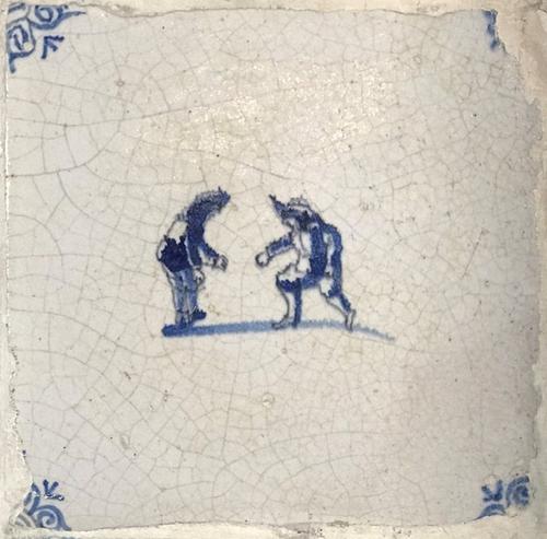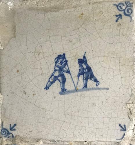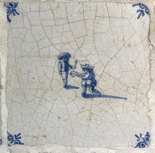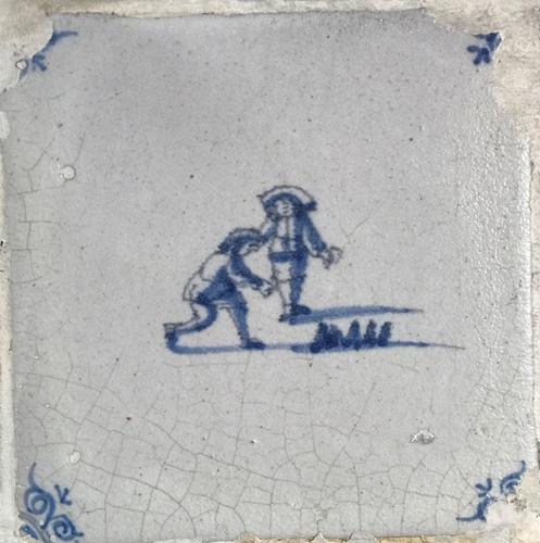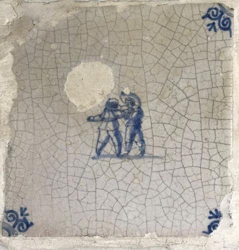 Tegel van aardewerk met tinglazuur voorstellende boksen
