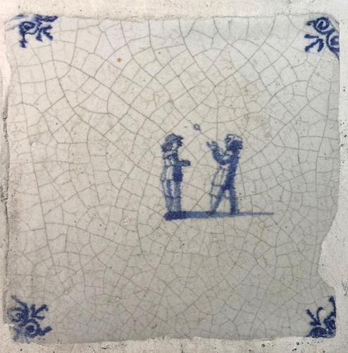 Tegel van aardewerk met tinglazuur voorstellende bal...