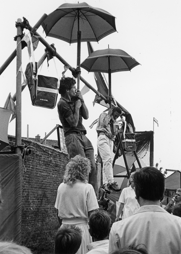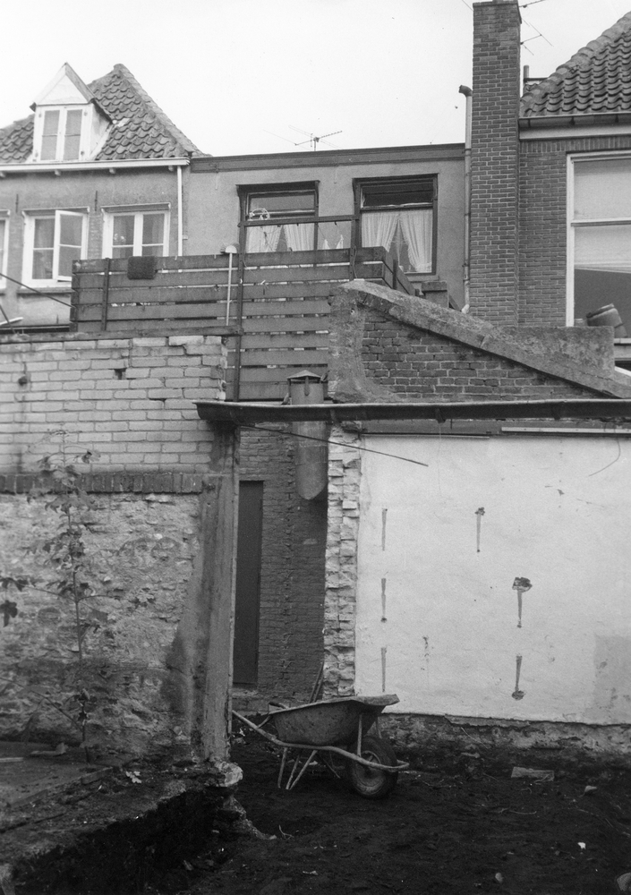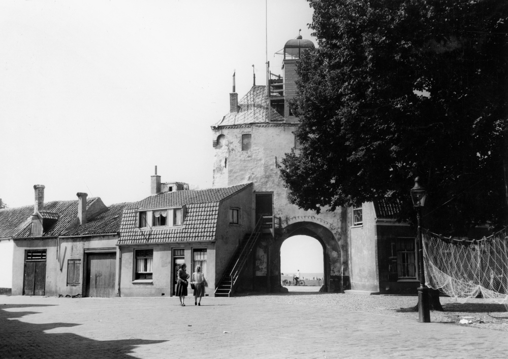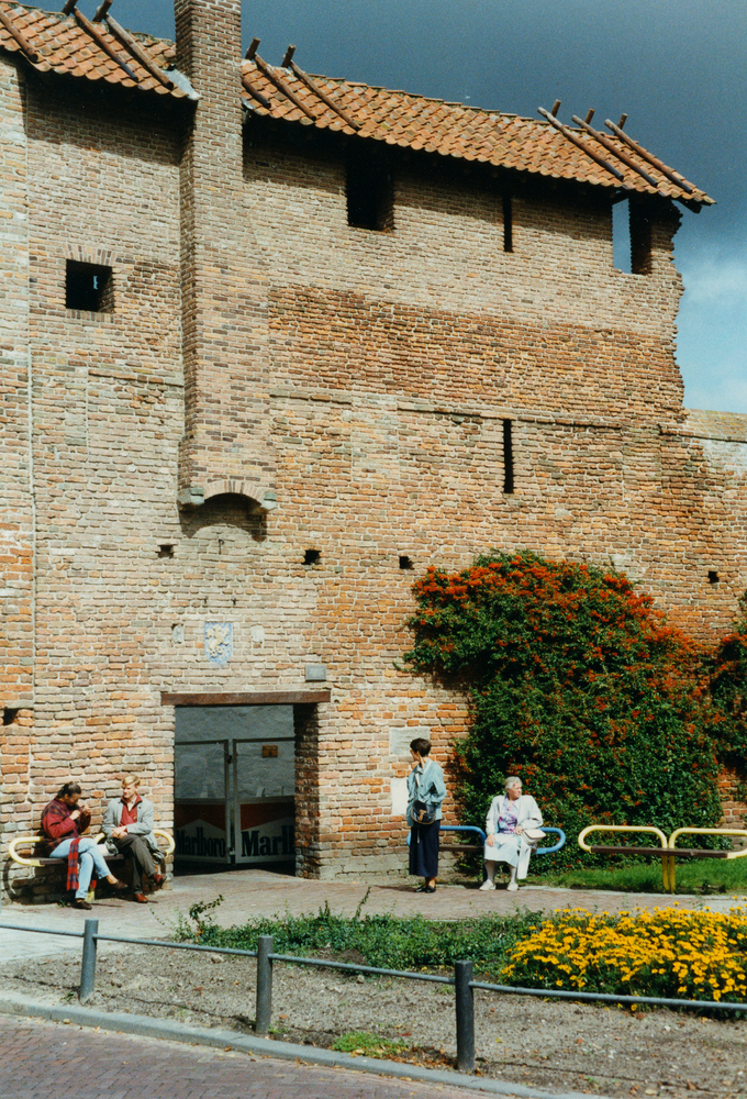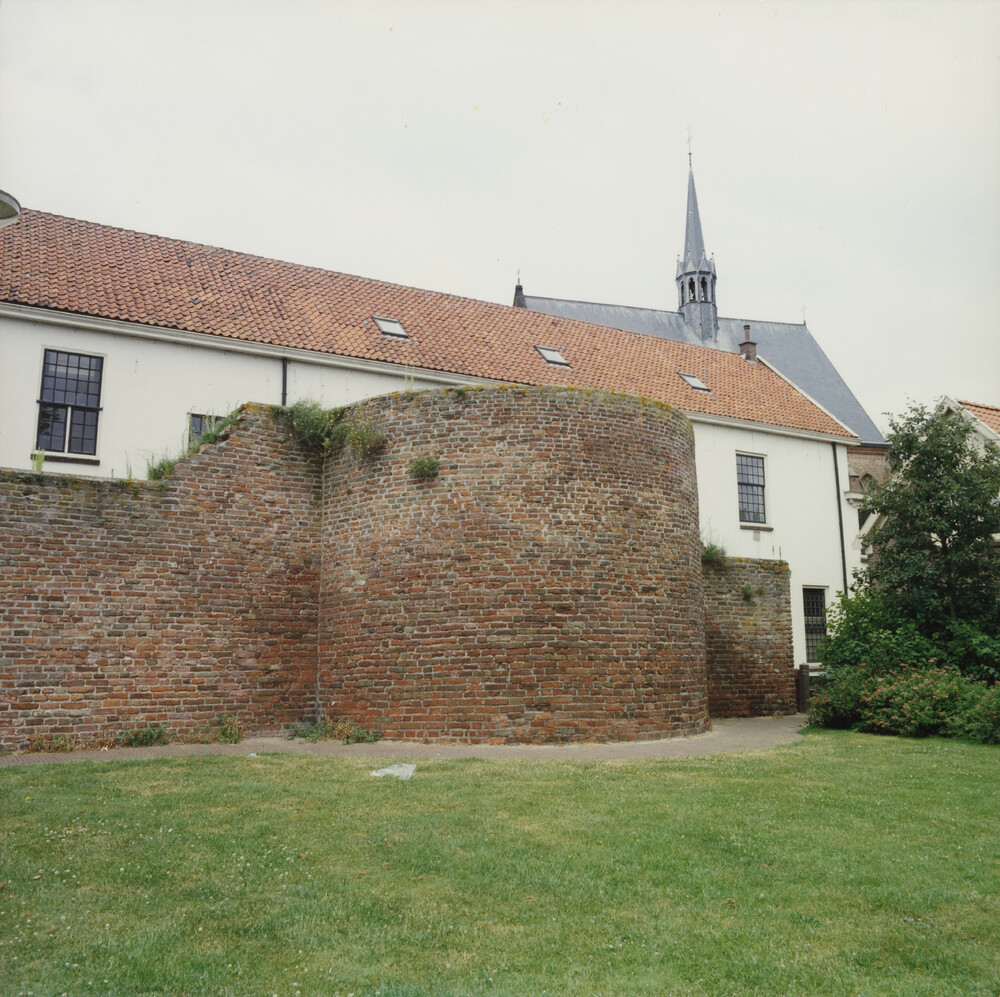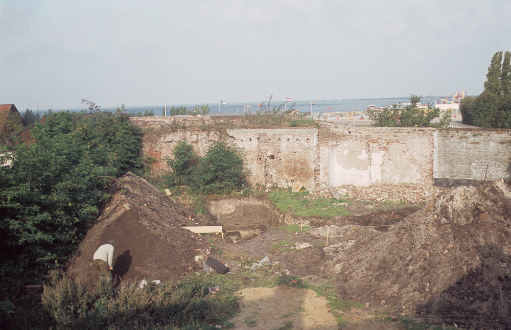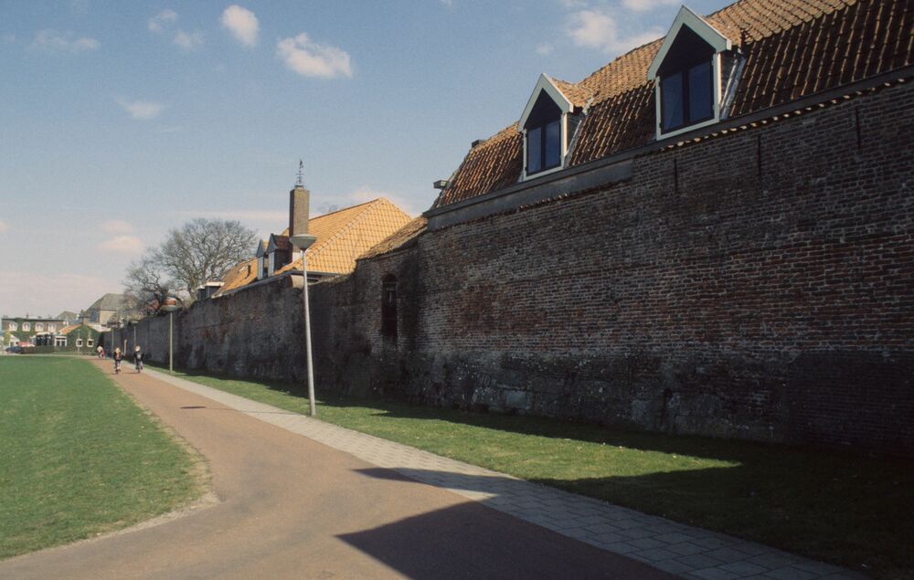 De stadsmuur en het wachtlokaal naast de afgebroken ...