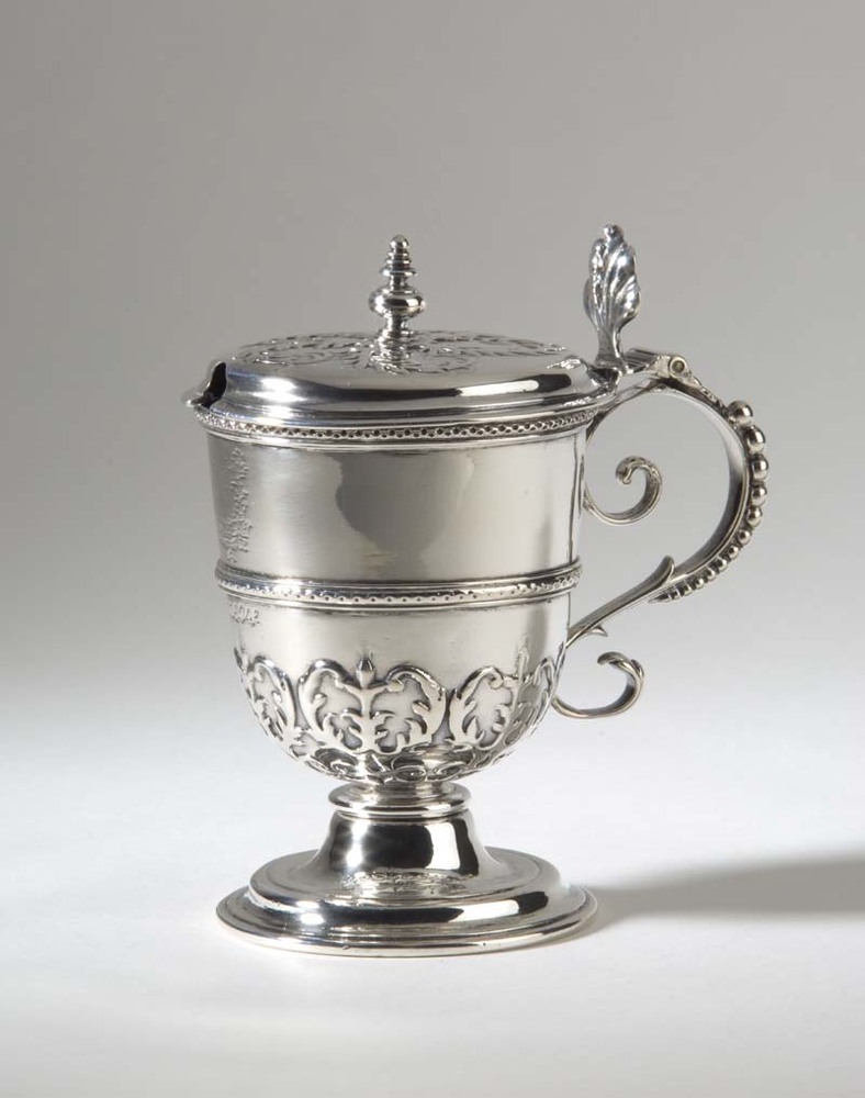 Zilveren mosterdpot met bladerranken in apliquewerk