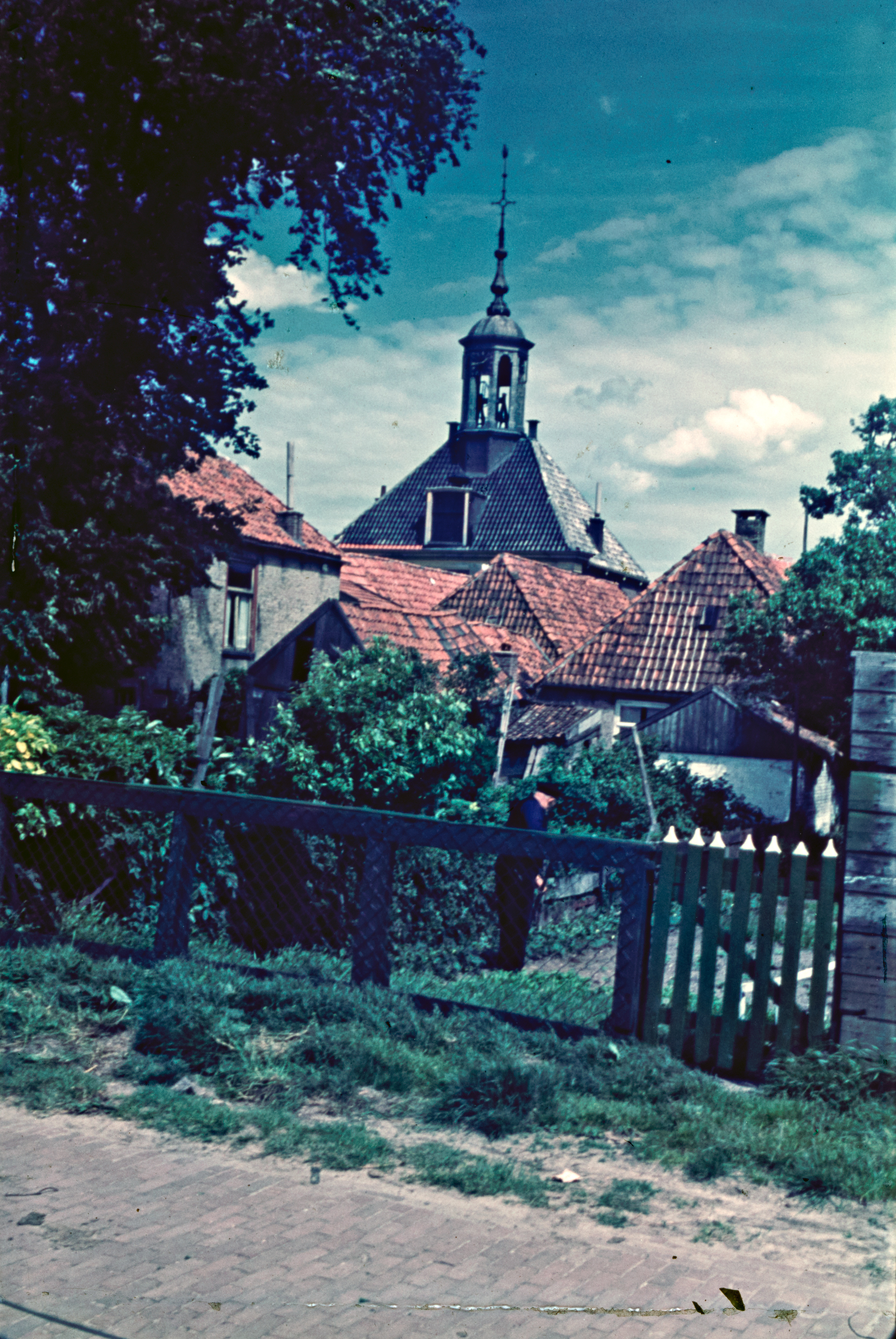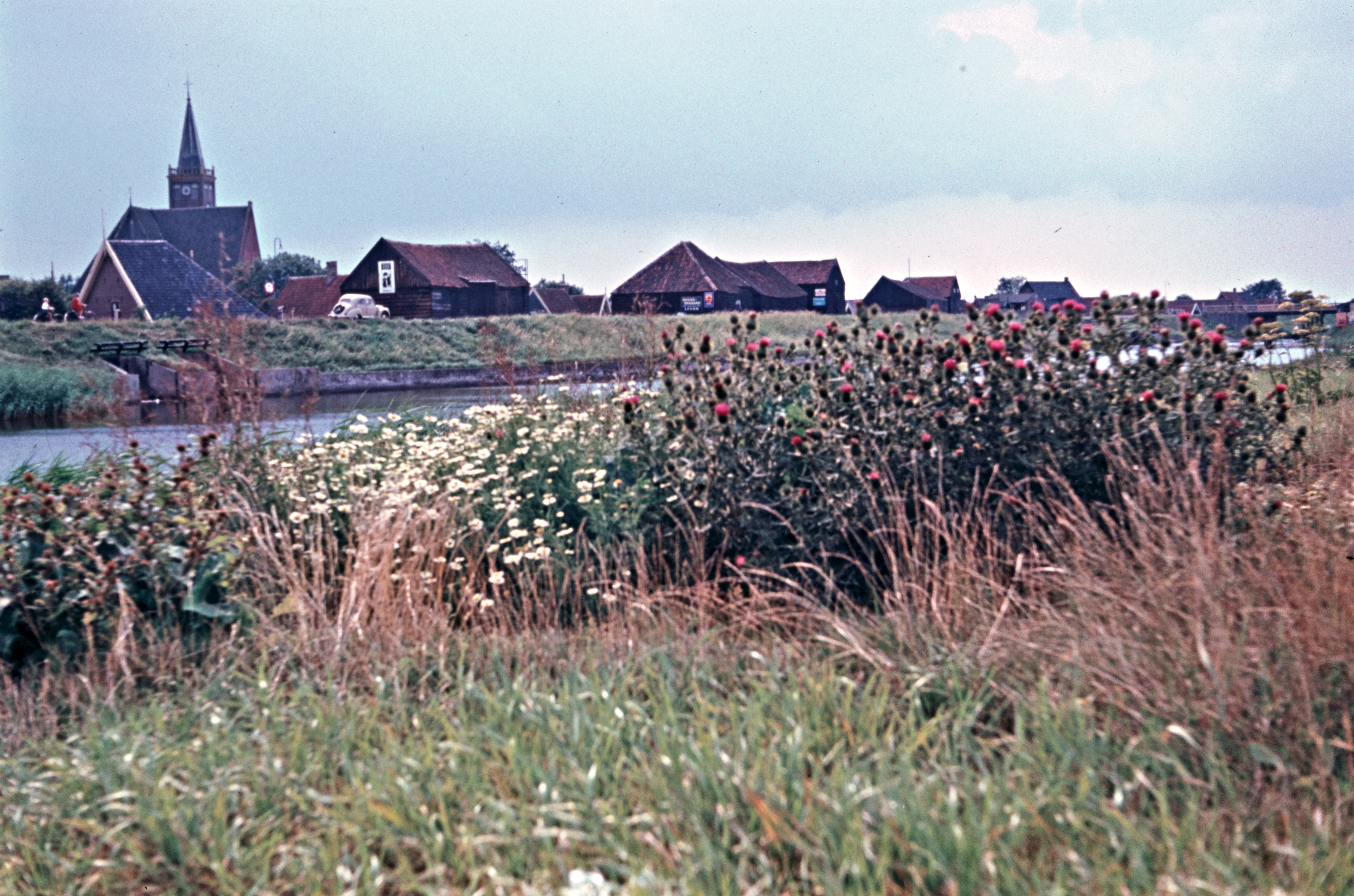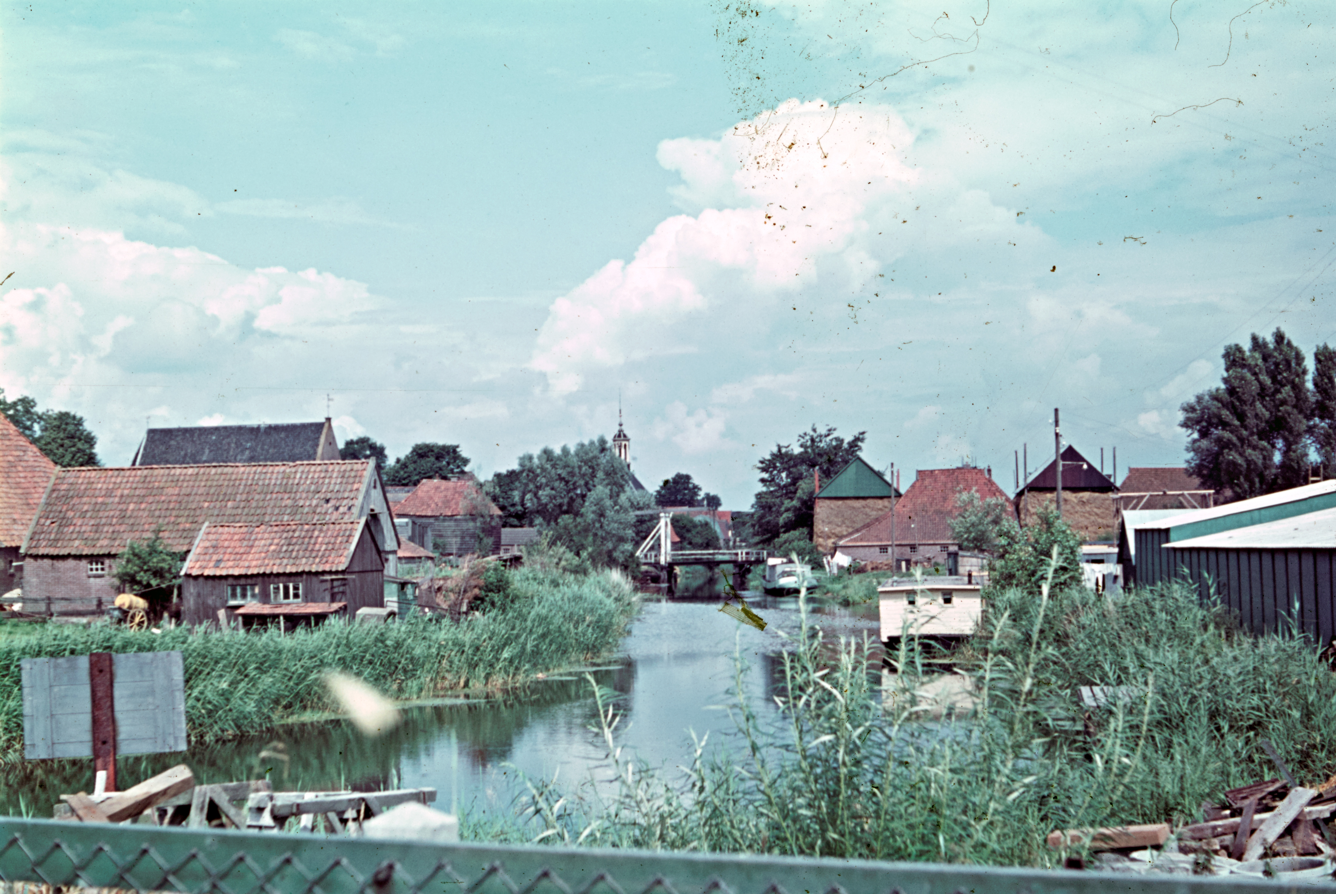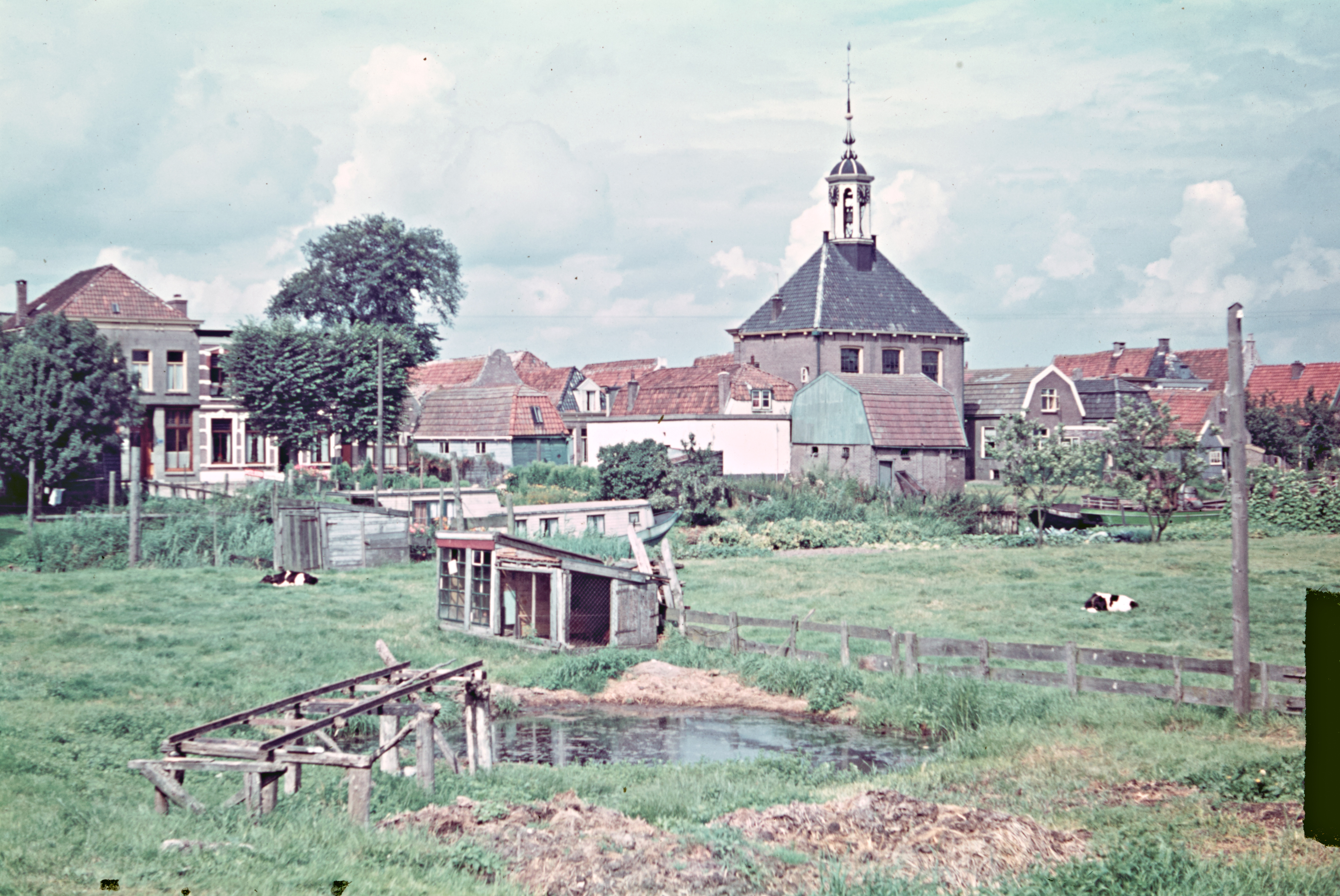 Kuinre gezien vanaf een boerenerf, raadhuis in de verte