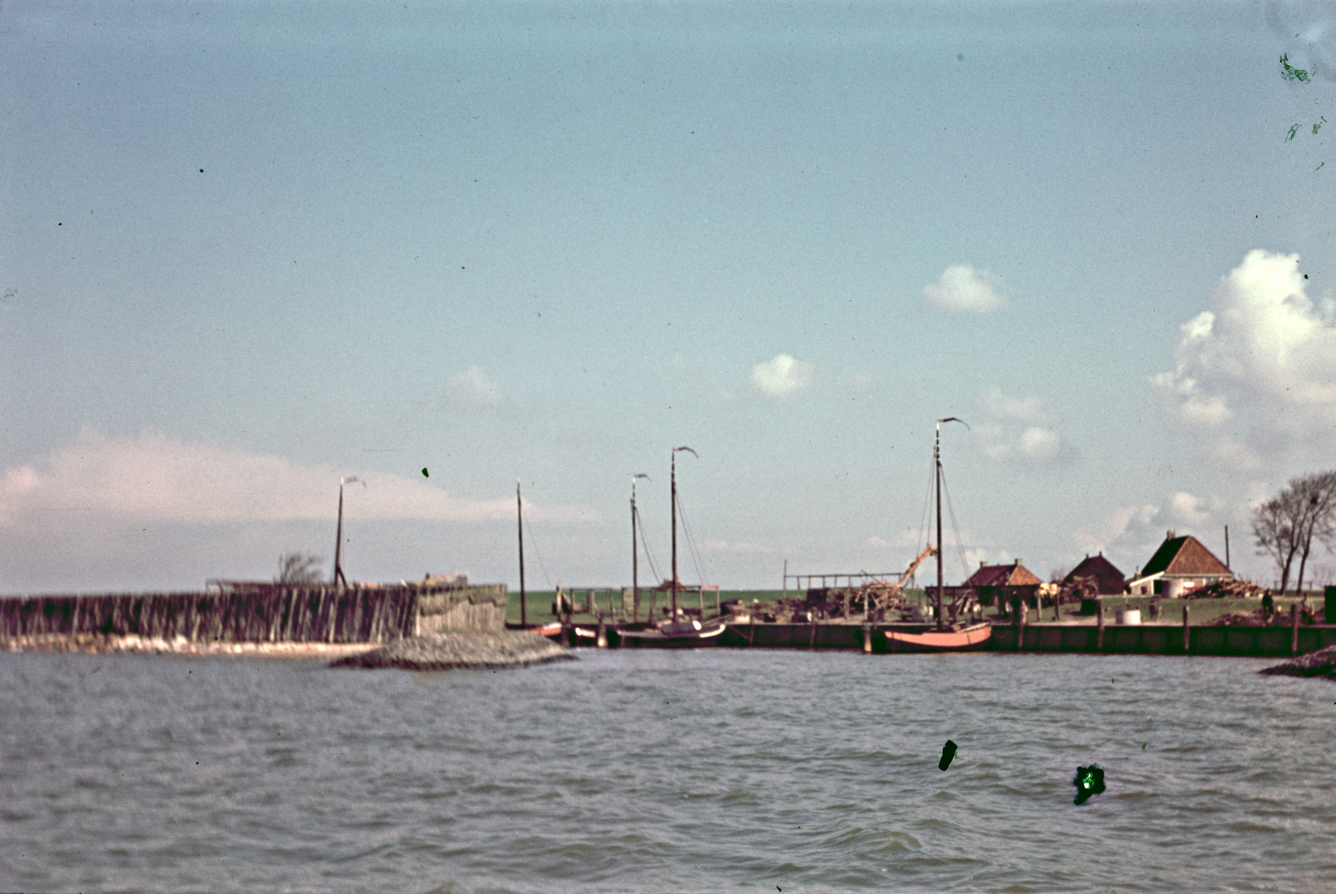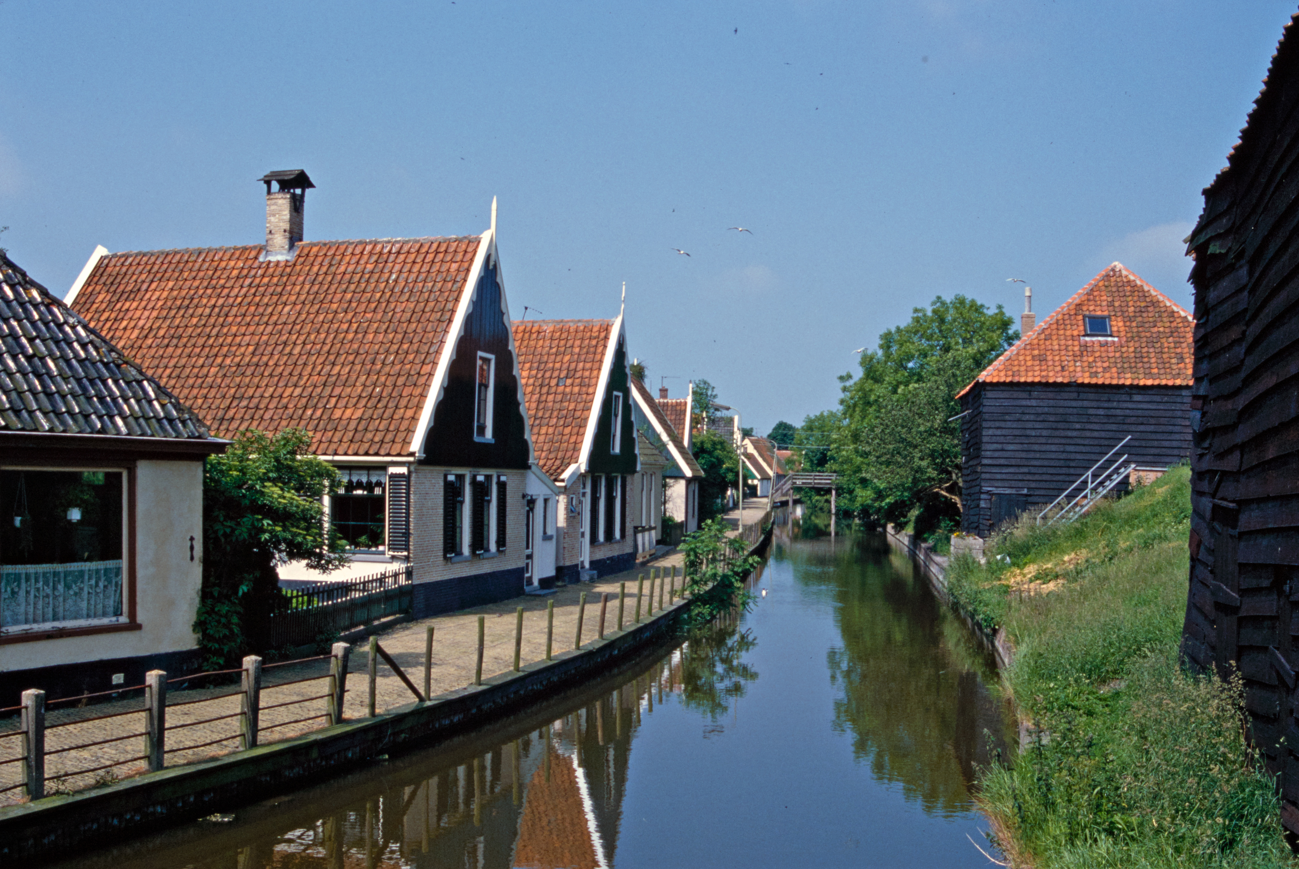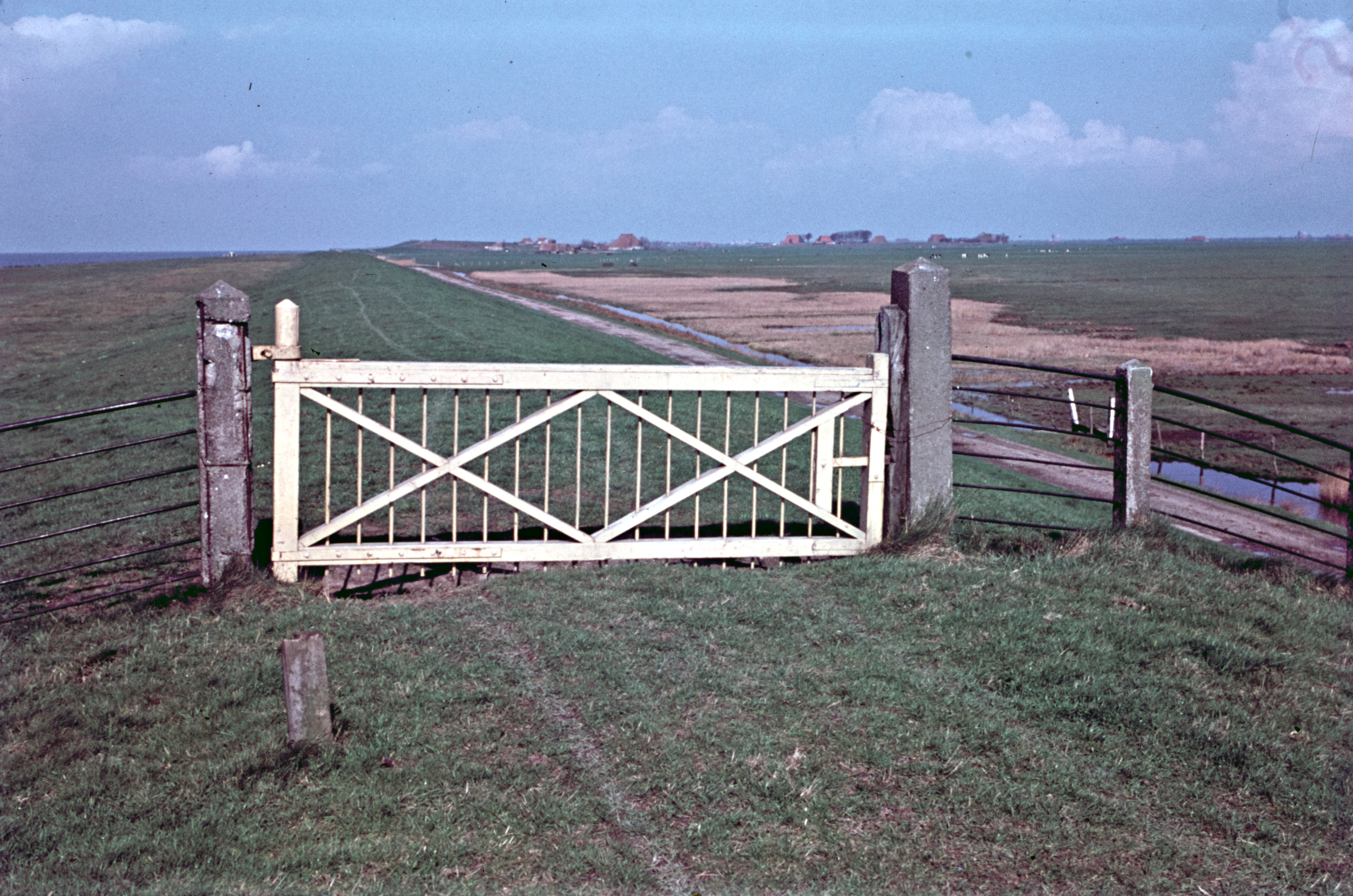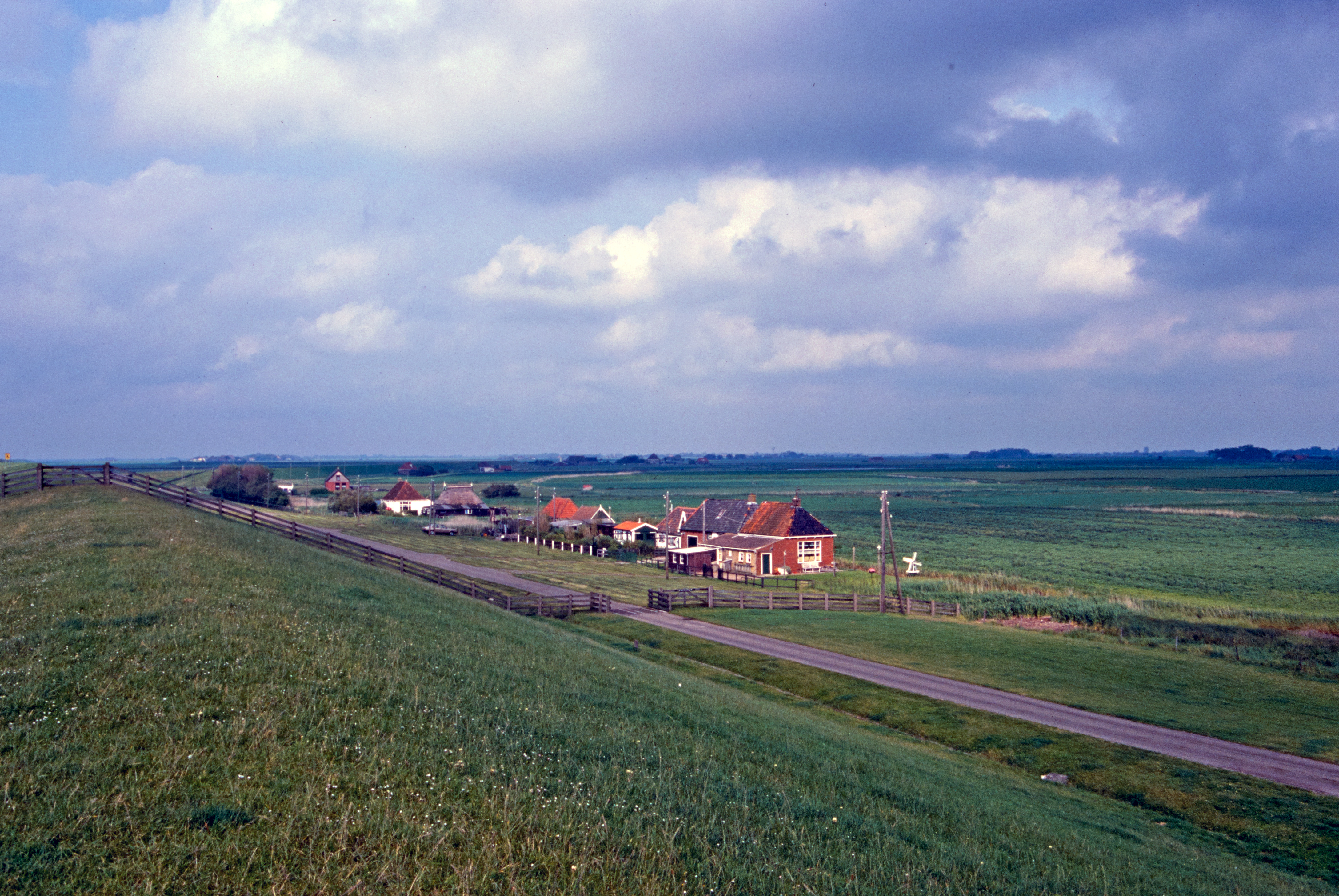 Kuinre gezien vanaf een boerenerf, raadhuis in de verte