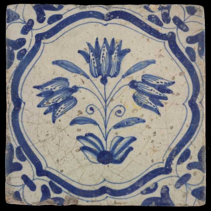 Bloemtegel met drietulp in accolade, blauw decor op ...