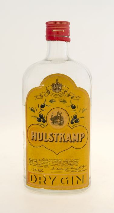 Blanke Hulstkamp fles met geel etiket "DRY GIN"