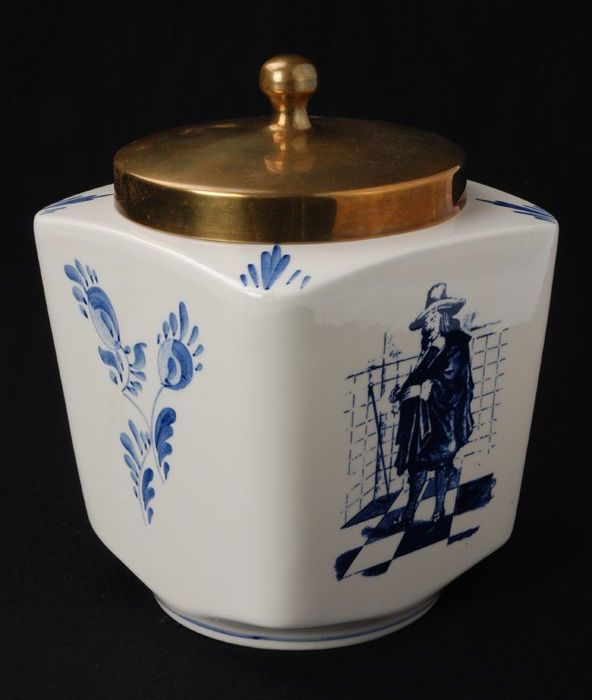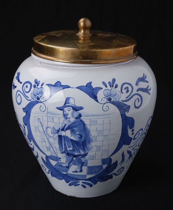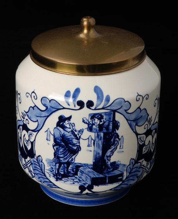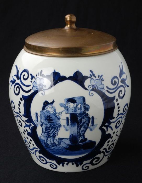 Delfts blauwe voorraadpot voor tabak met koperen dek...