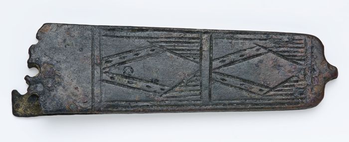 Koperen riemtong, leerbeslag met gegraveerde ruiten ...