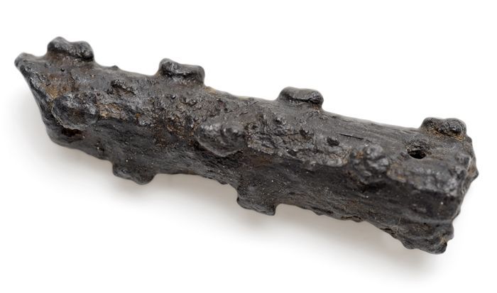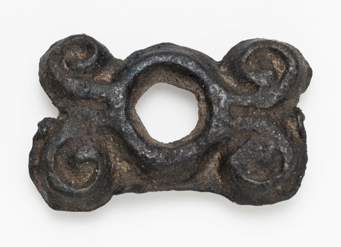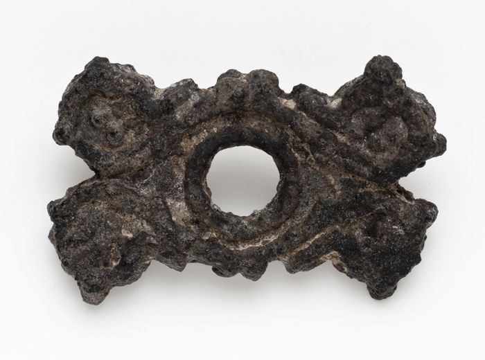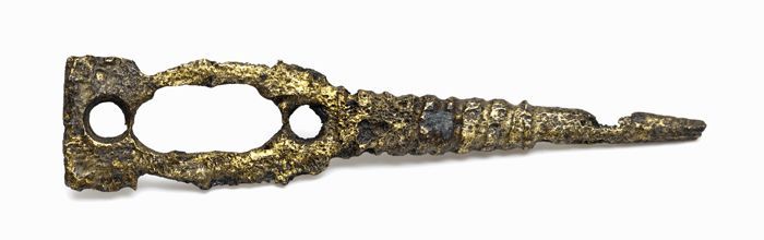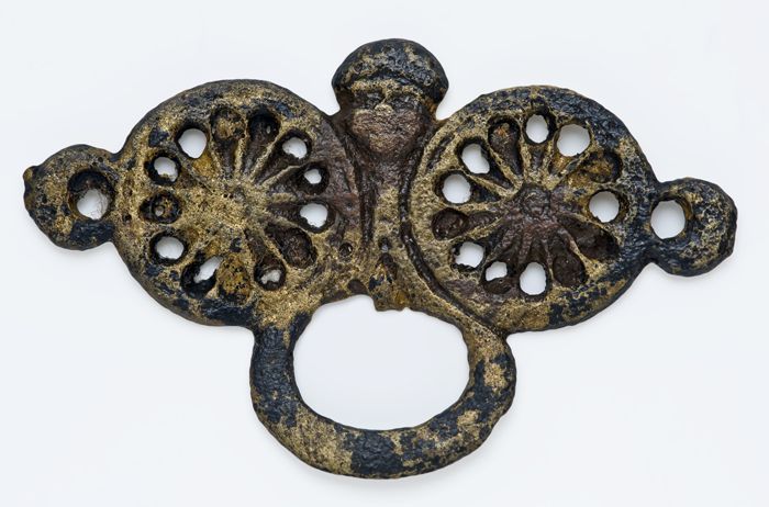 Koperen beslag met lange angel, twee ronde bevestigi...